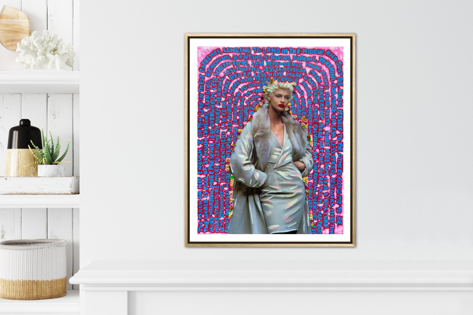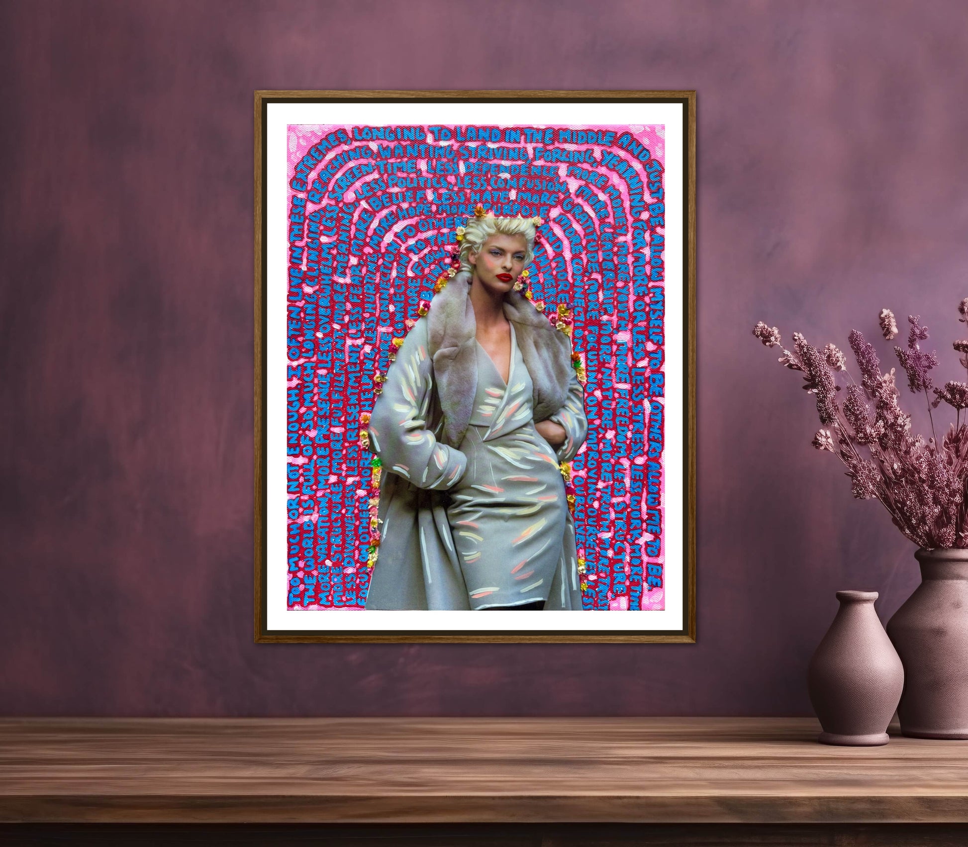 “Just Be” is a 11x14in Glicée fine art print of an original Mixed Media painting made with a vintage fashion magazine featuring Linda Evangelista in 90s fashion reimagined into art with acrylic paint, oil based paint pens, words of wisdom, and resin on canvas.