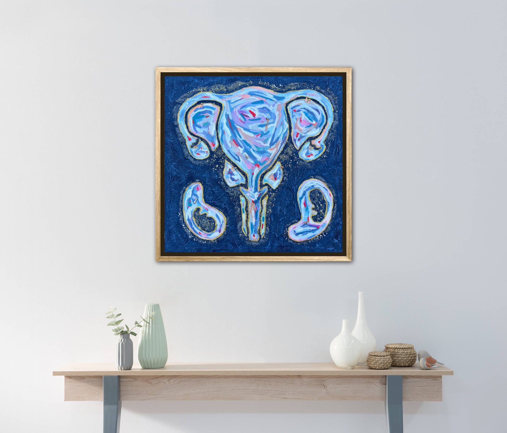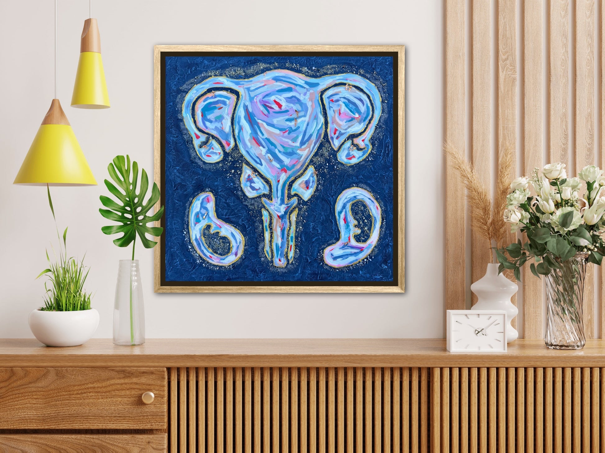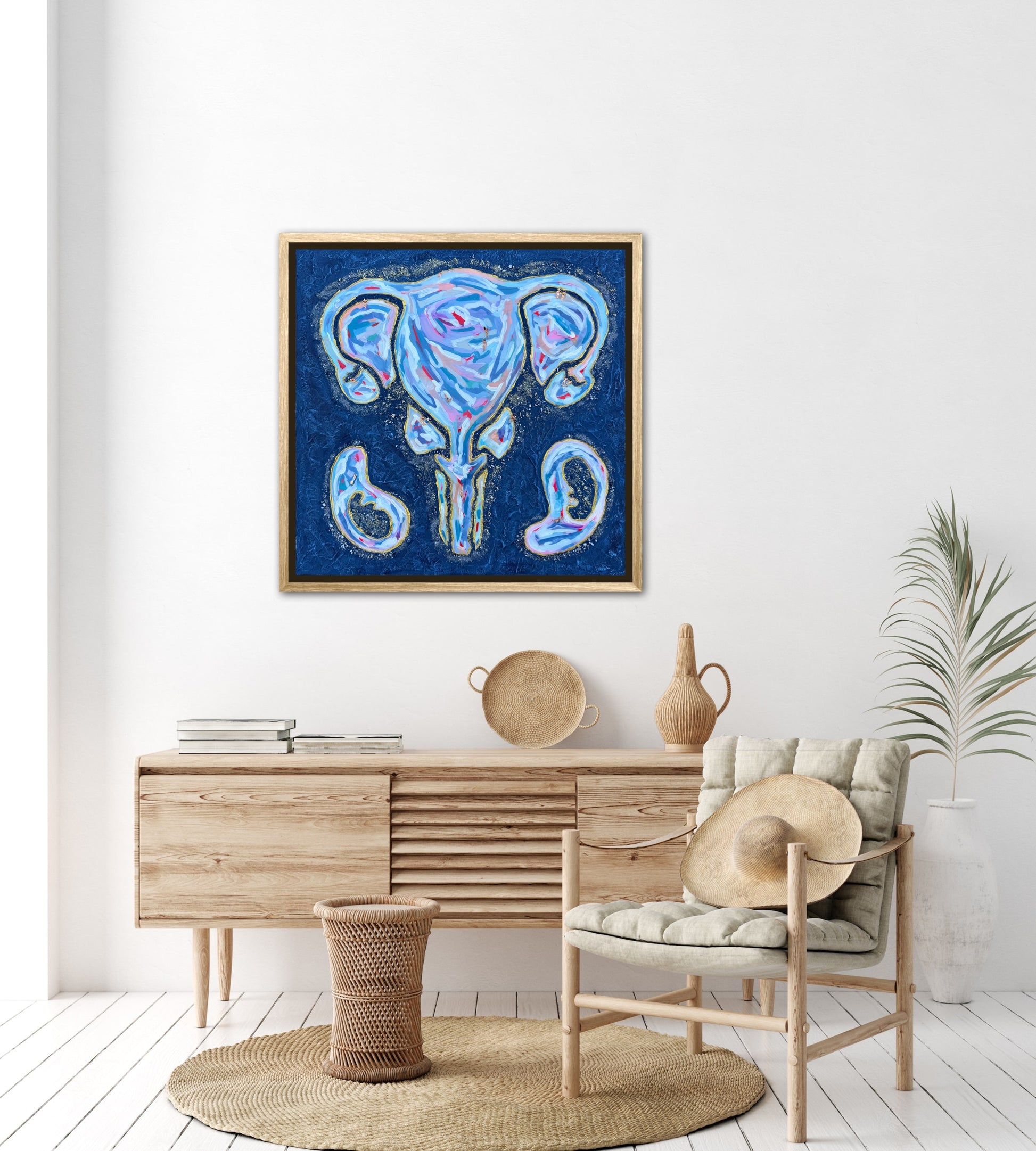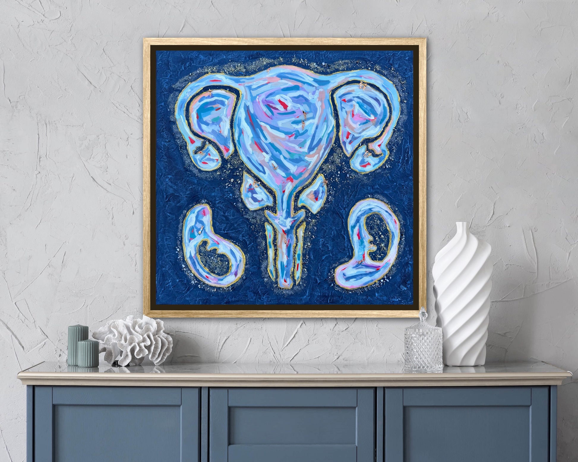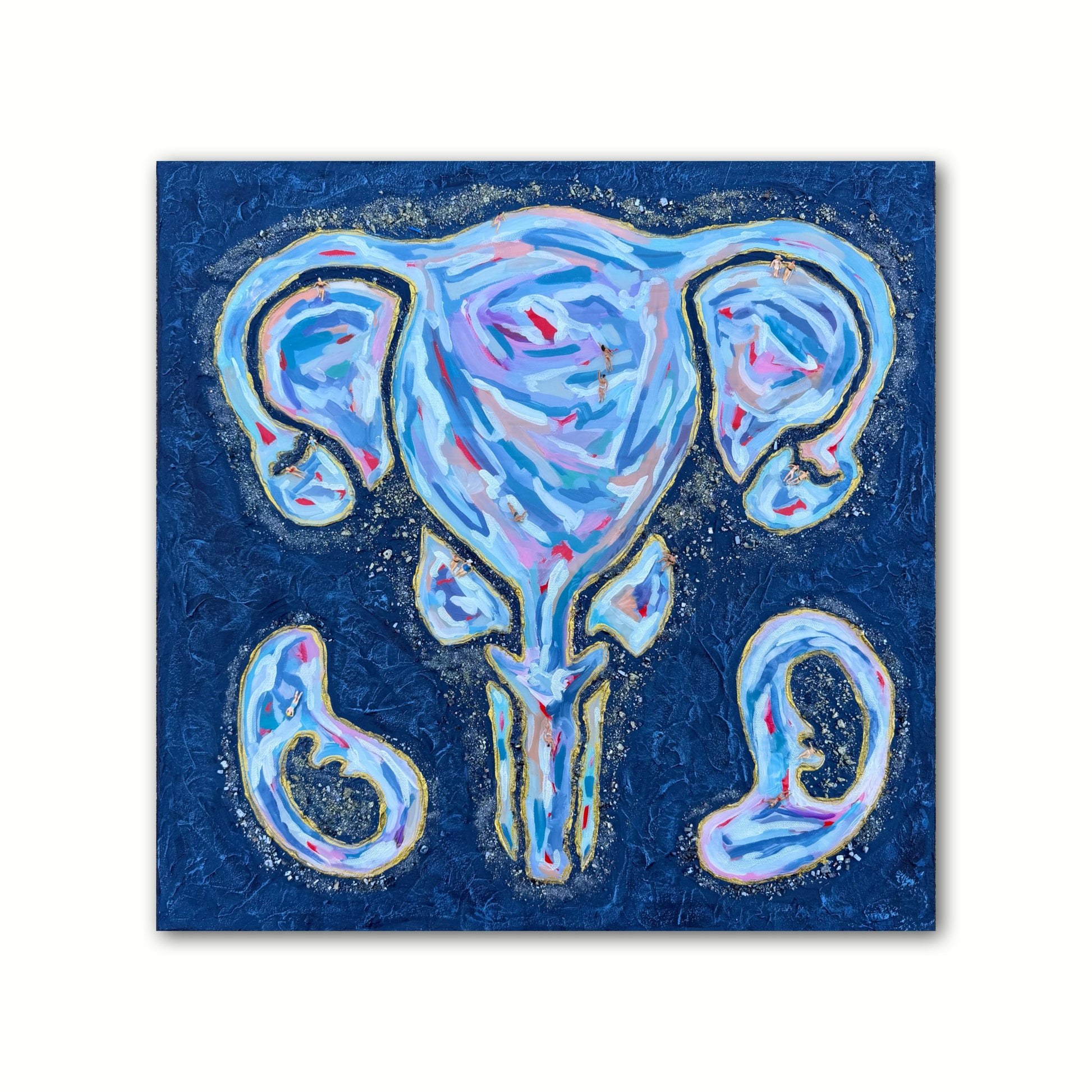 This piece was created with sand, resin, crushed minerals, acrylic paint, and miniature swimmers suspended in a luminous, womb-like landscape. A place that feels like both a return to origin and an escape. A resort before consciousness. A remembering before choice.