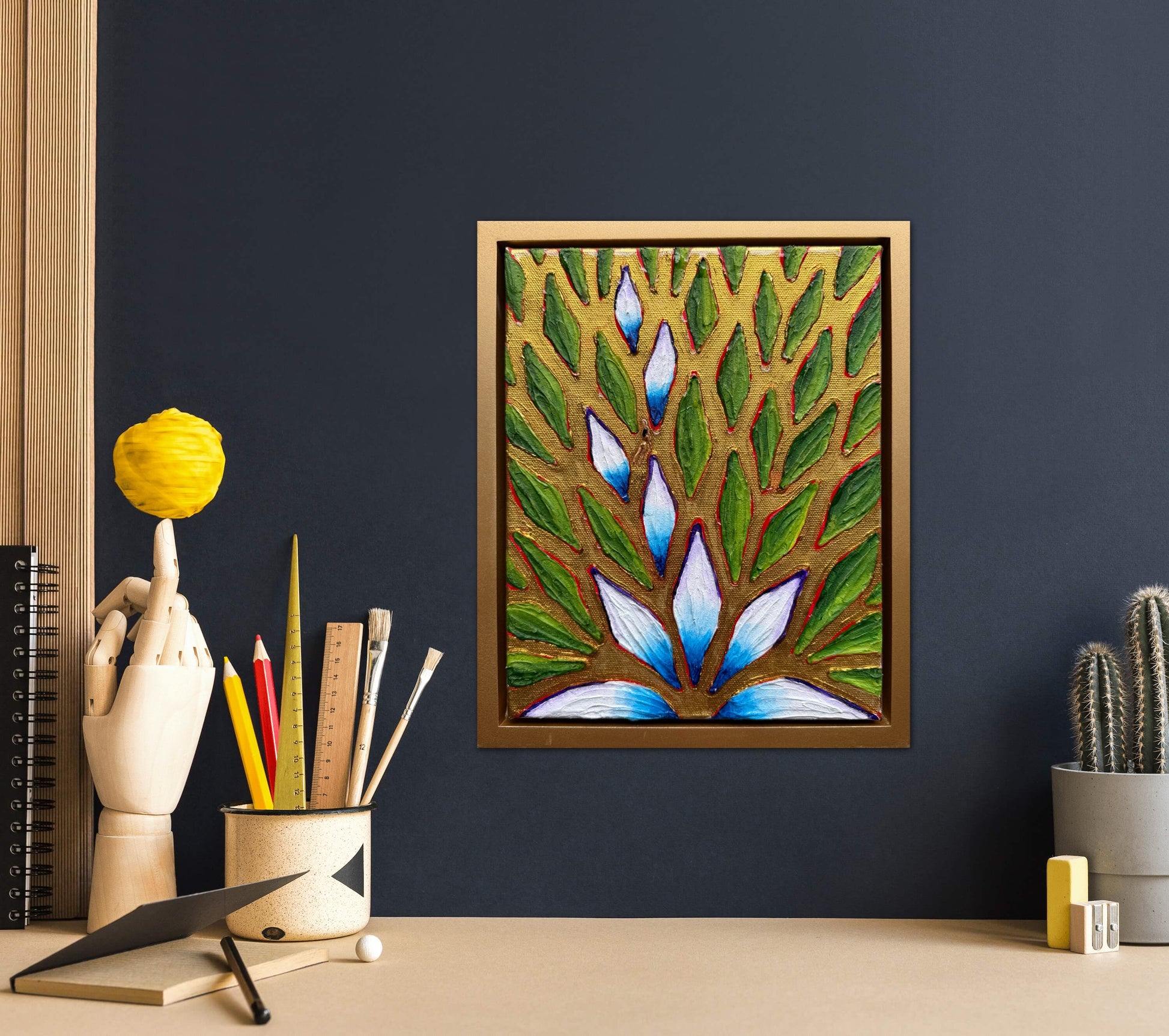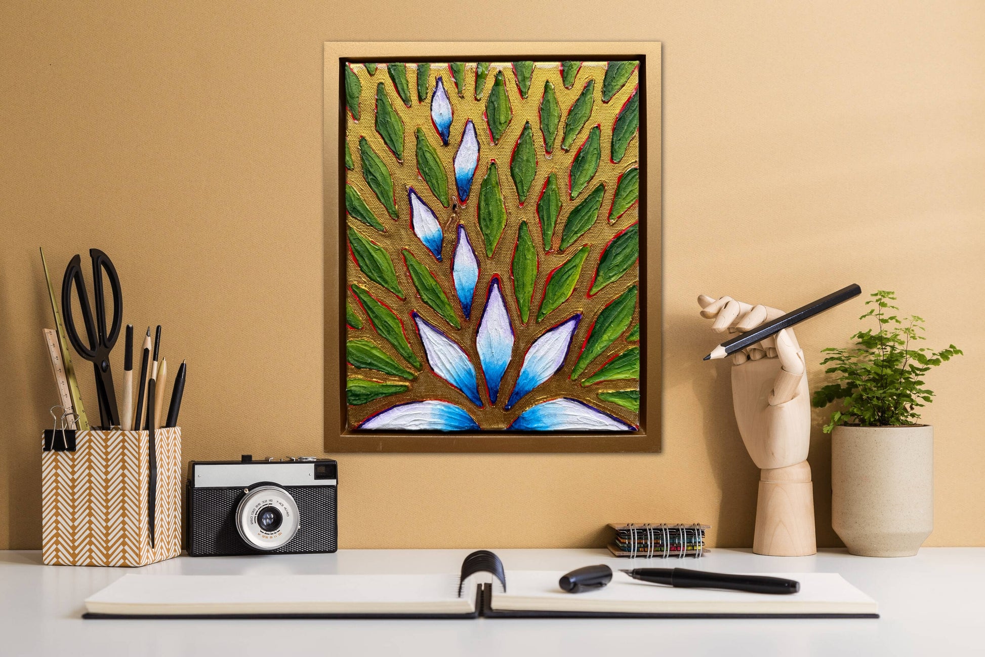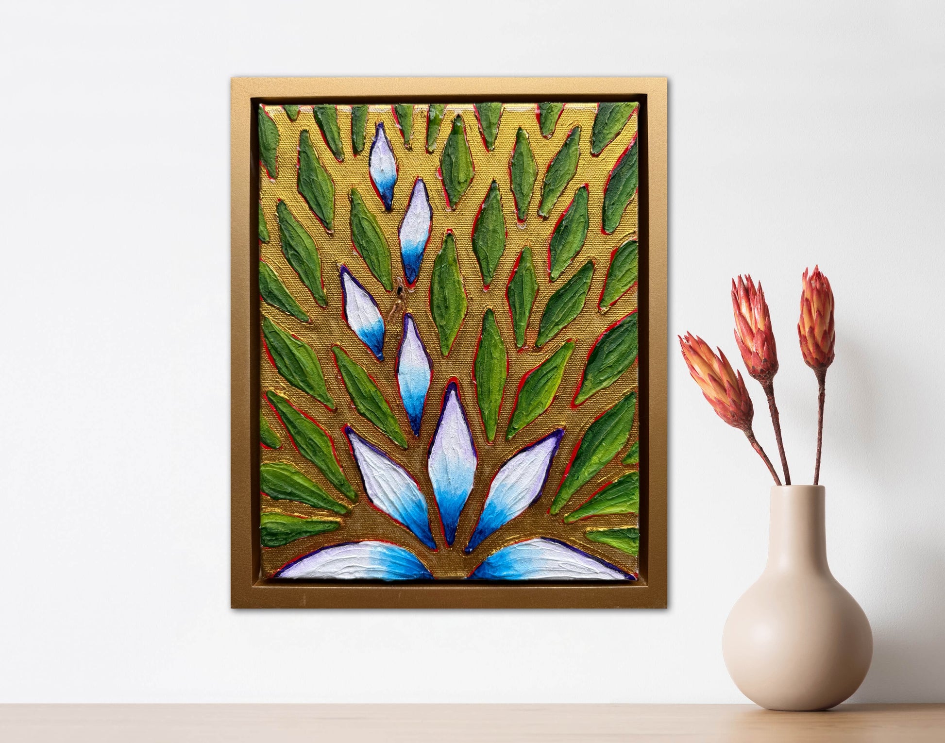 “The Golden Path’ 8x10in (9x11in framed) Mixed Media: sand, vibrant acrylic paint, resin, mosaic tiles, and a miniature swimmer figurine on 1.5in thick professional grade stretched canvas in a solid natural wood float frame.