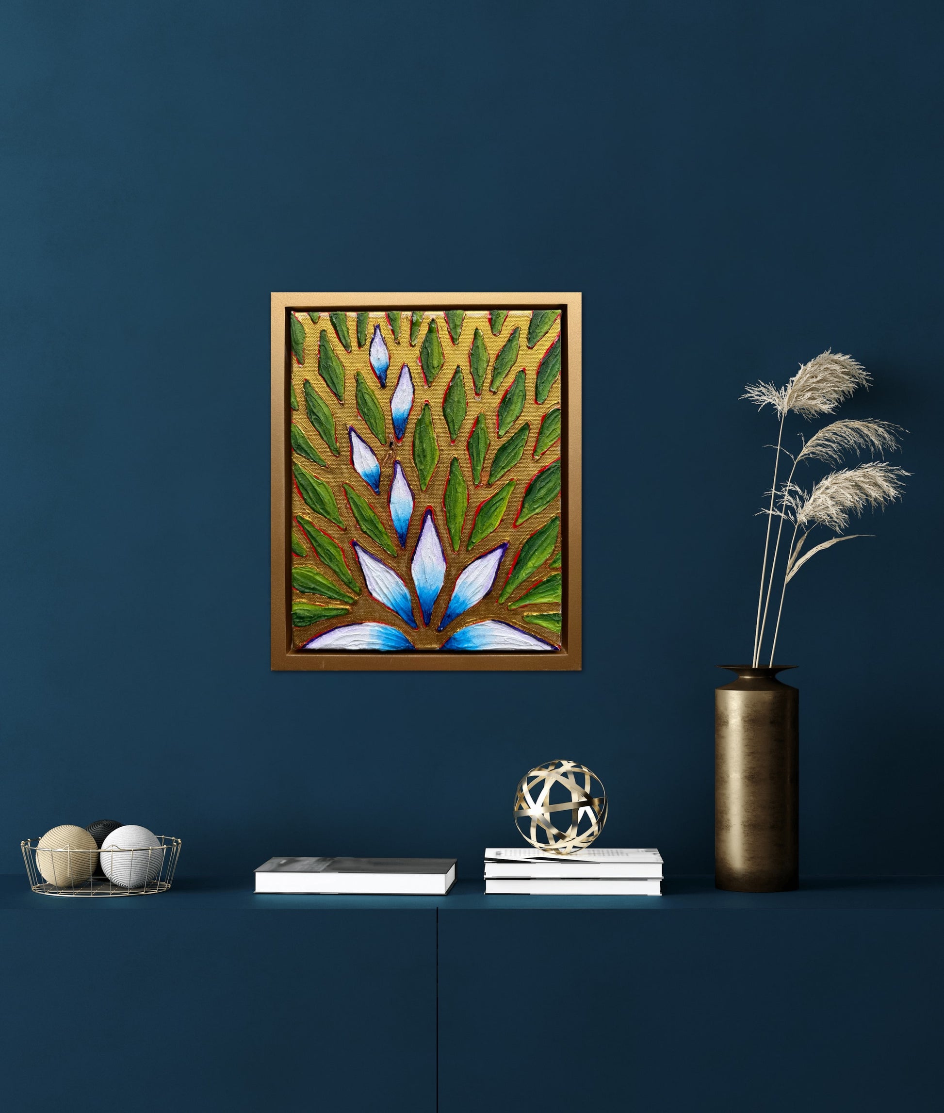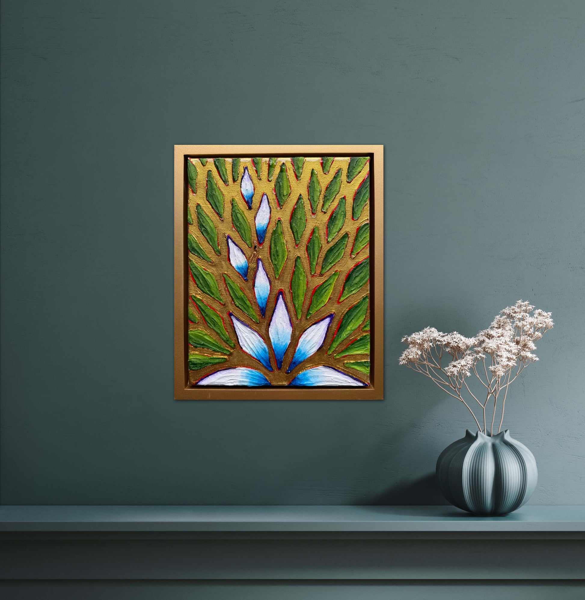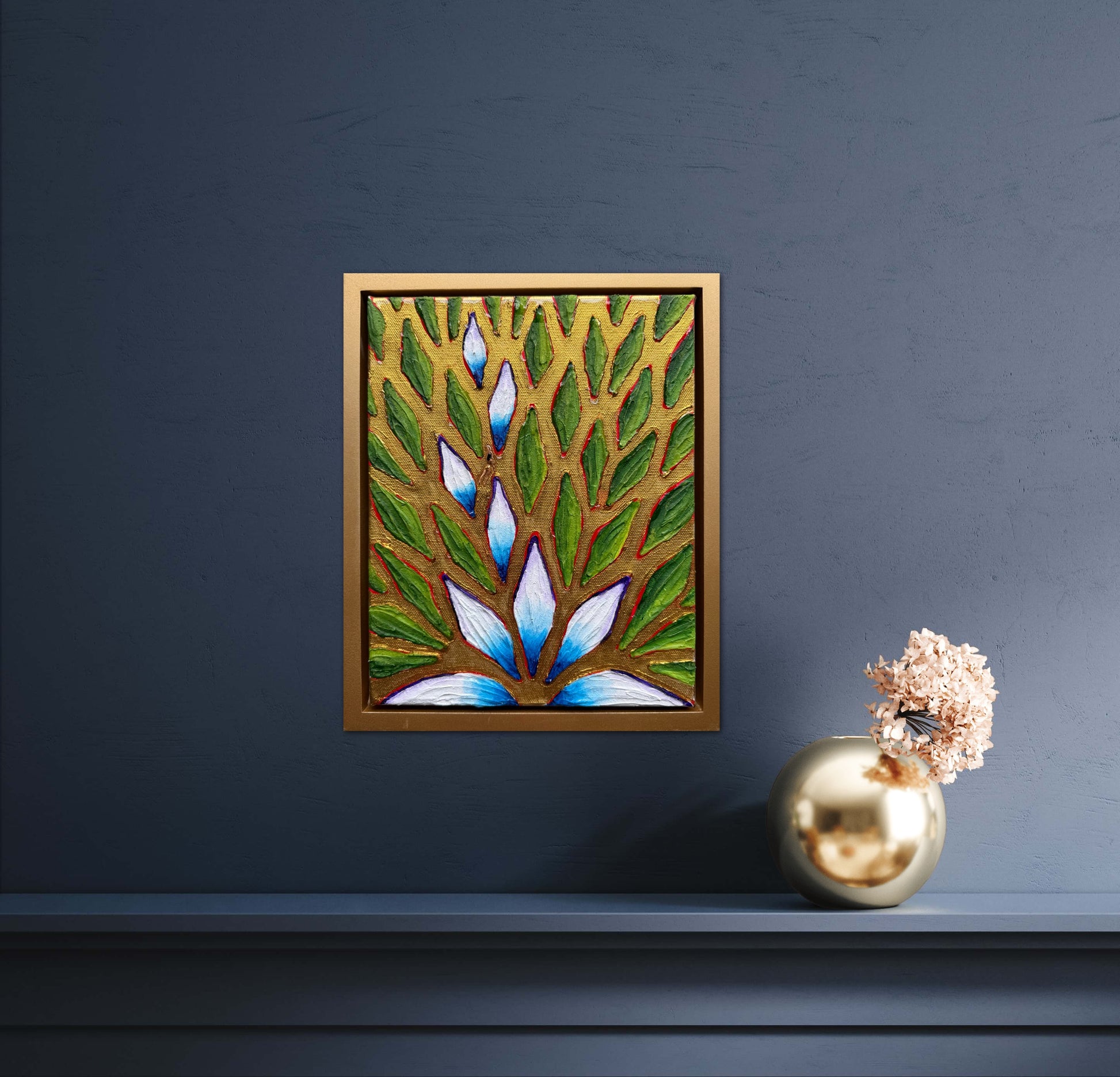 “The Golden Path’ 8x10in (9x11in framed) Mixed Media: sand, vibrant acrylic paint, resin, mosaic tiles, and a miniature swimmer figurine on 1.5in thick professional grade stretched canvas in a solid natural wood float frame.