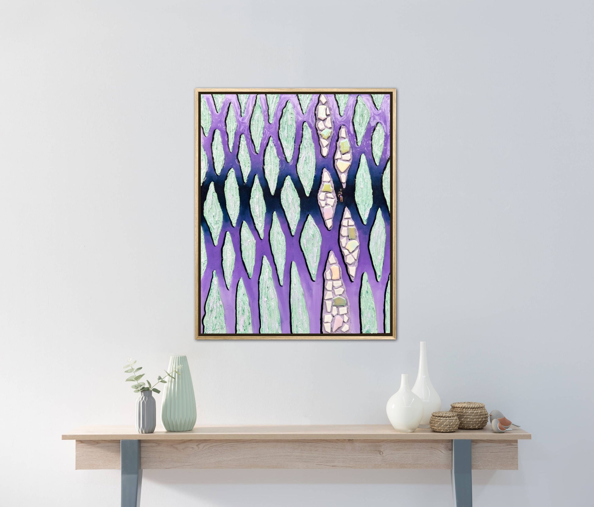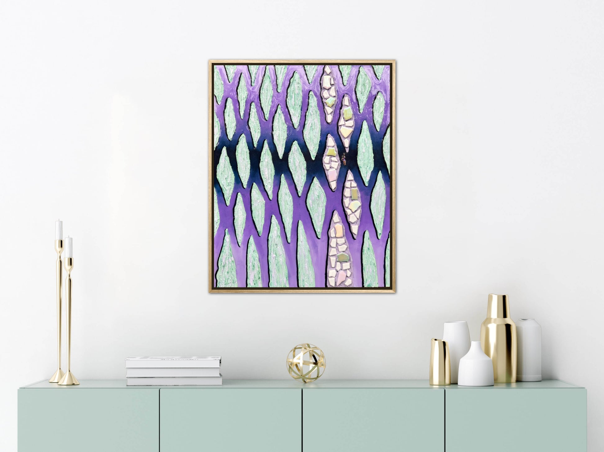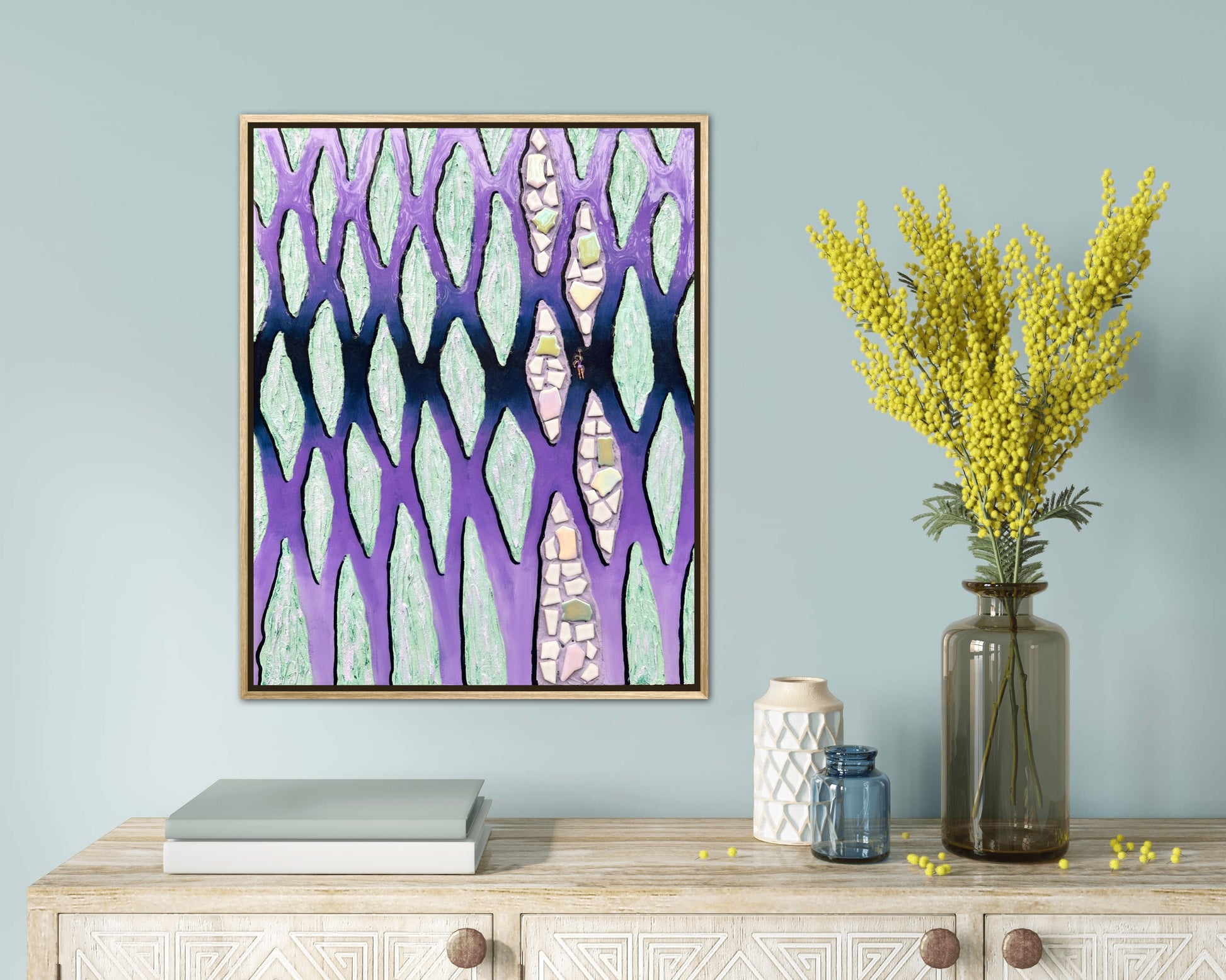 16x20in (17x21in framed) Mixed Media: sand, vibrant acrylic paint, resin, mosaic tiles, and a miniature swimmer figurine on 1.5in thick professional grade stretched canvas in a solid natural wood float frame.