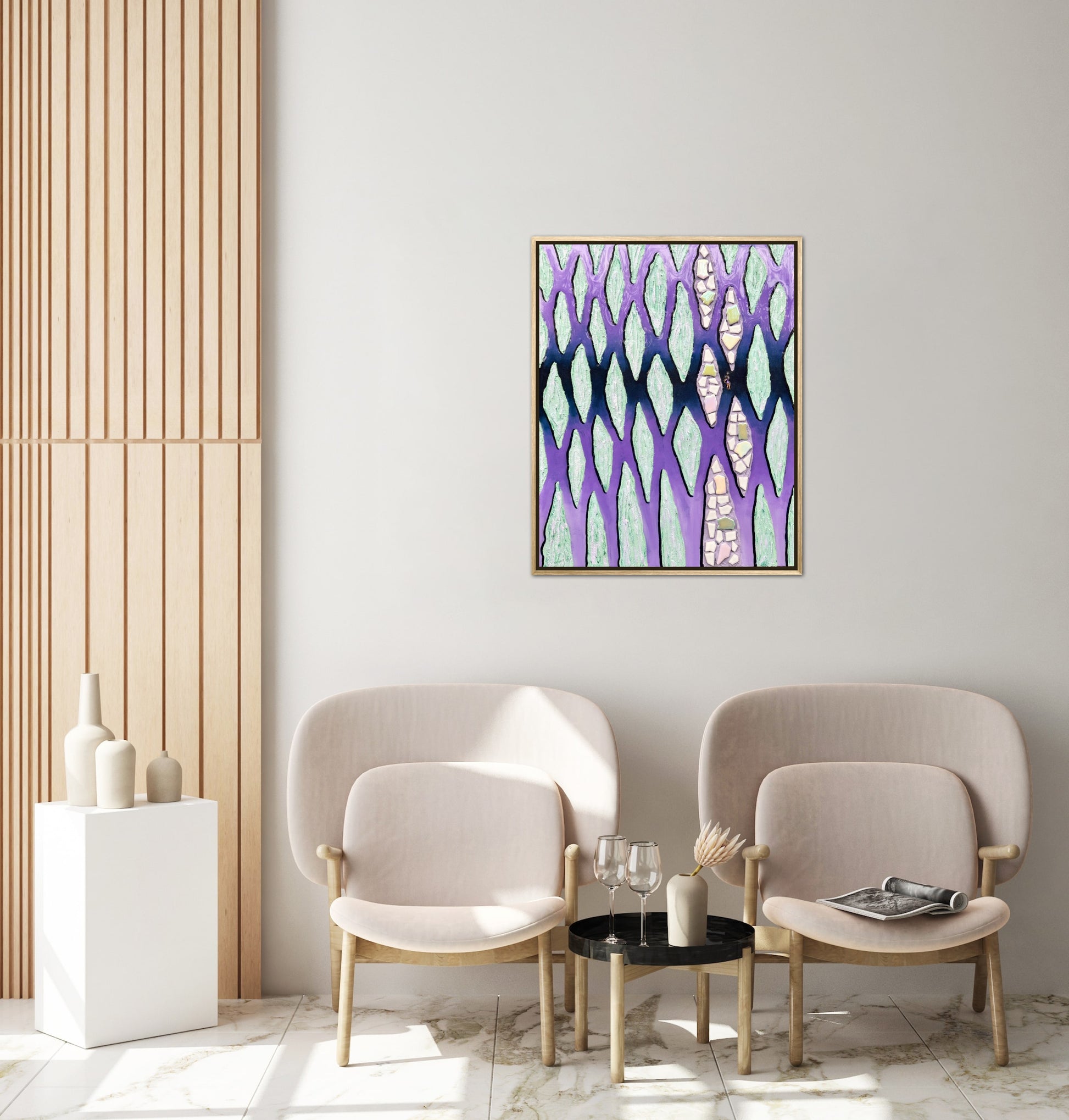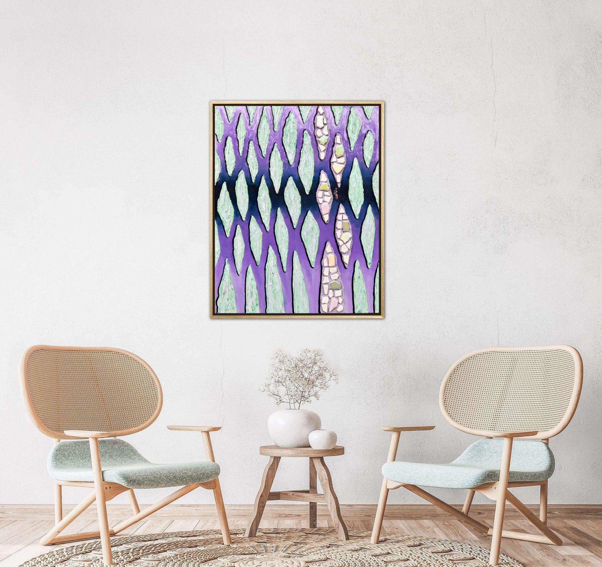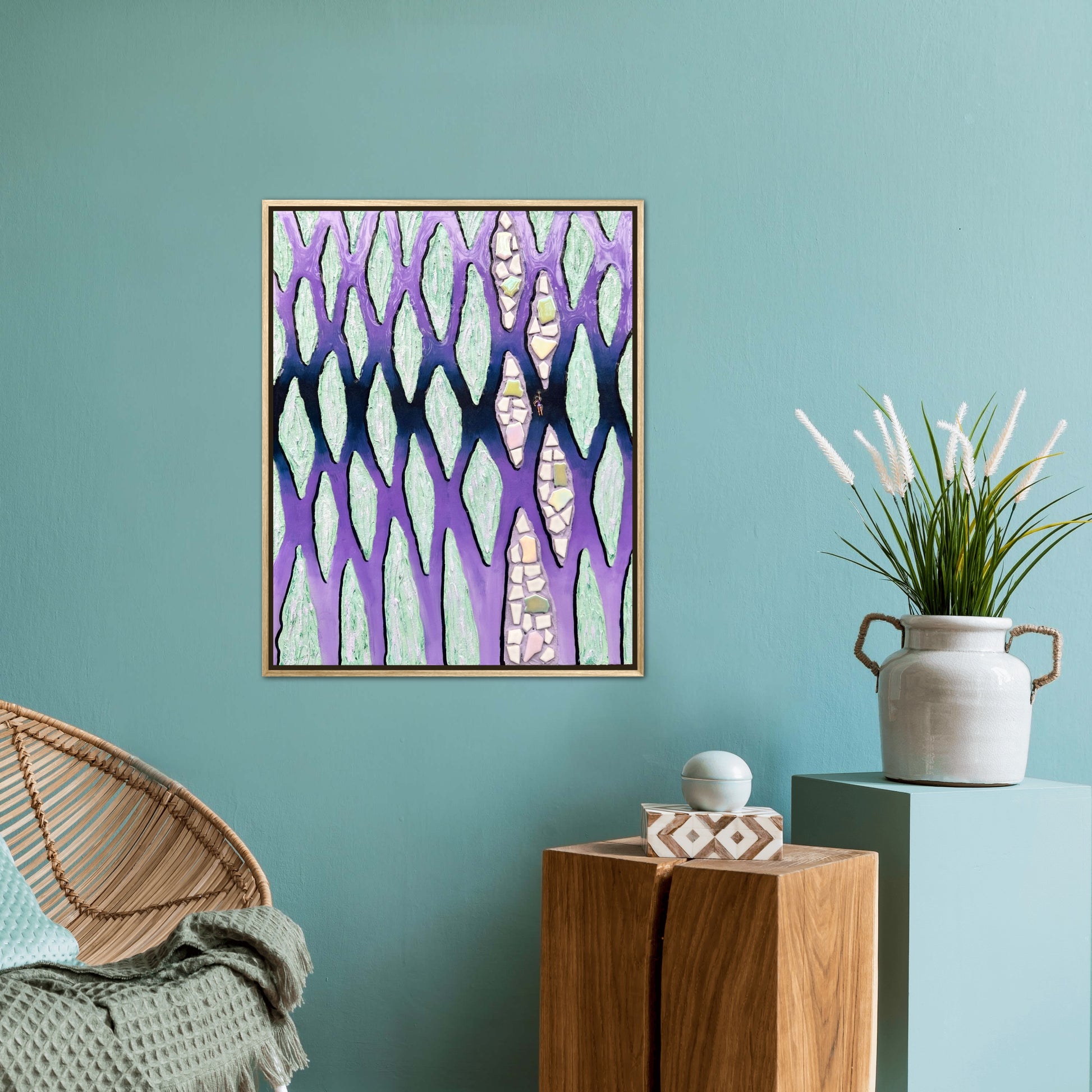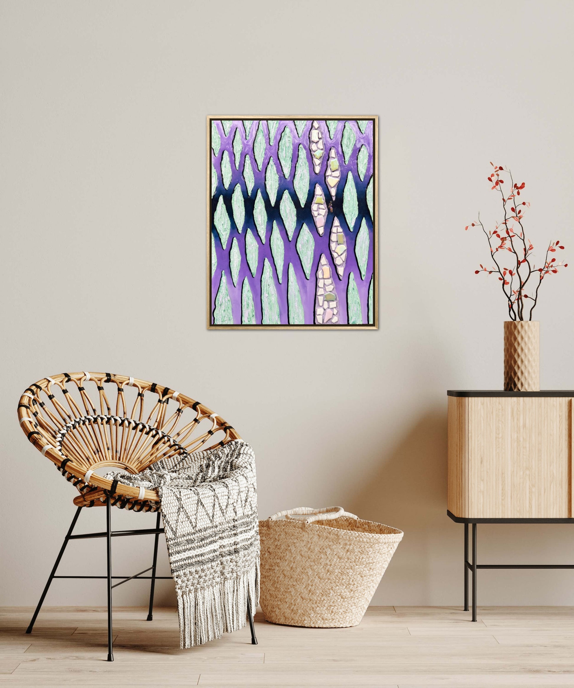 16x20in (17x21in framed) Mixed Media: sand, vibrant acrylic paint, resin, mosaic tiles, and a miniature swimmer figurine on 1.5in thick professional grade stretched canvas in a solid natural wood float frame.