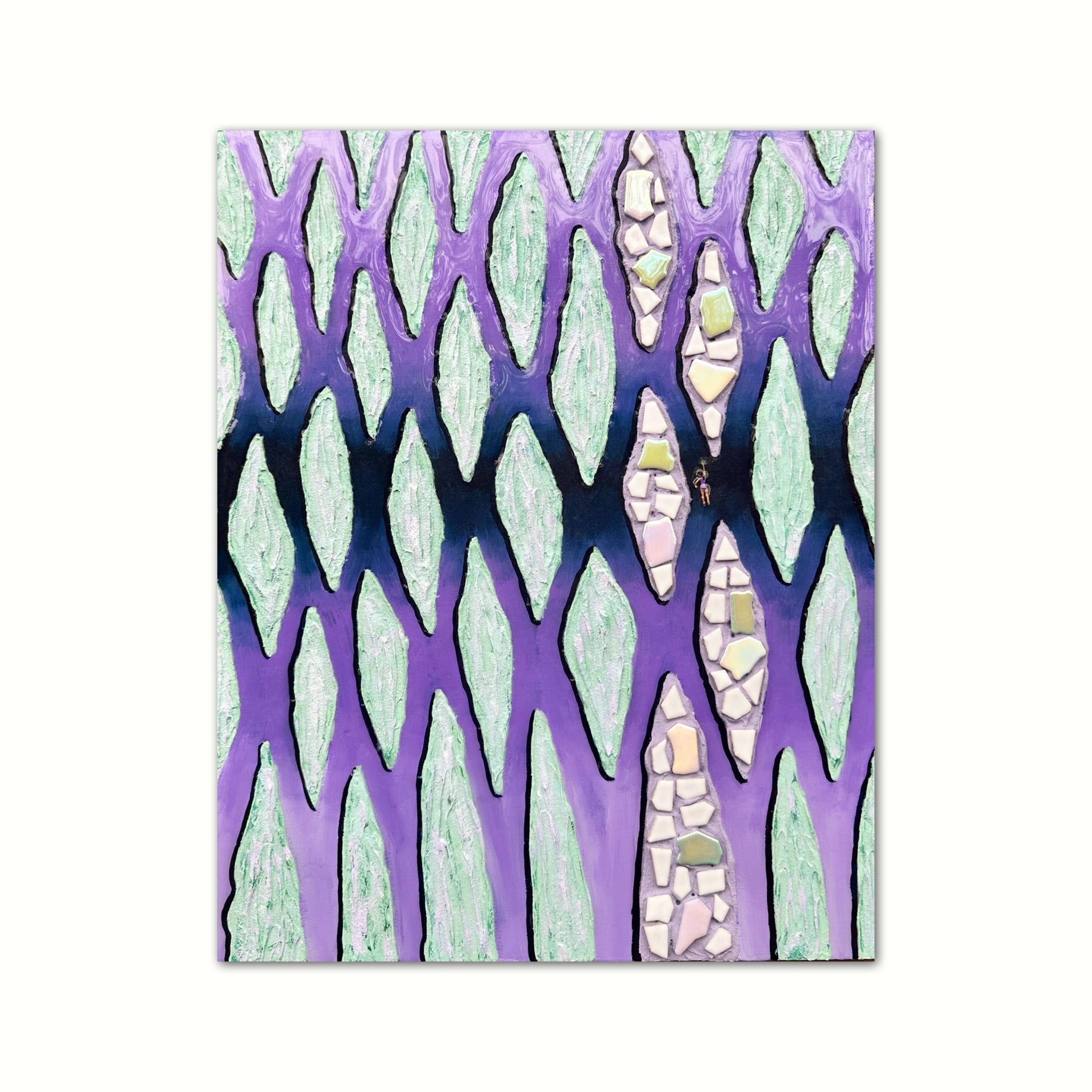 “The Path” is a series of captivating mixed media, bold, textured, abstract-yet-organic paintings made with sand, acrylic, resin, and a miniature swimmer figurine on canvas.