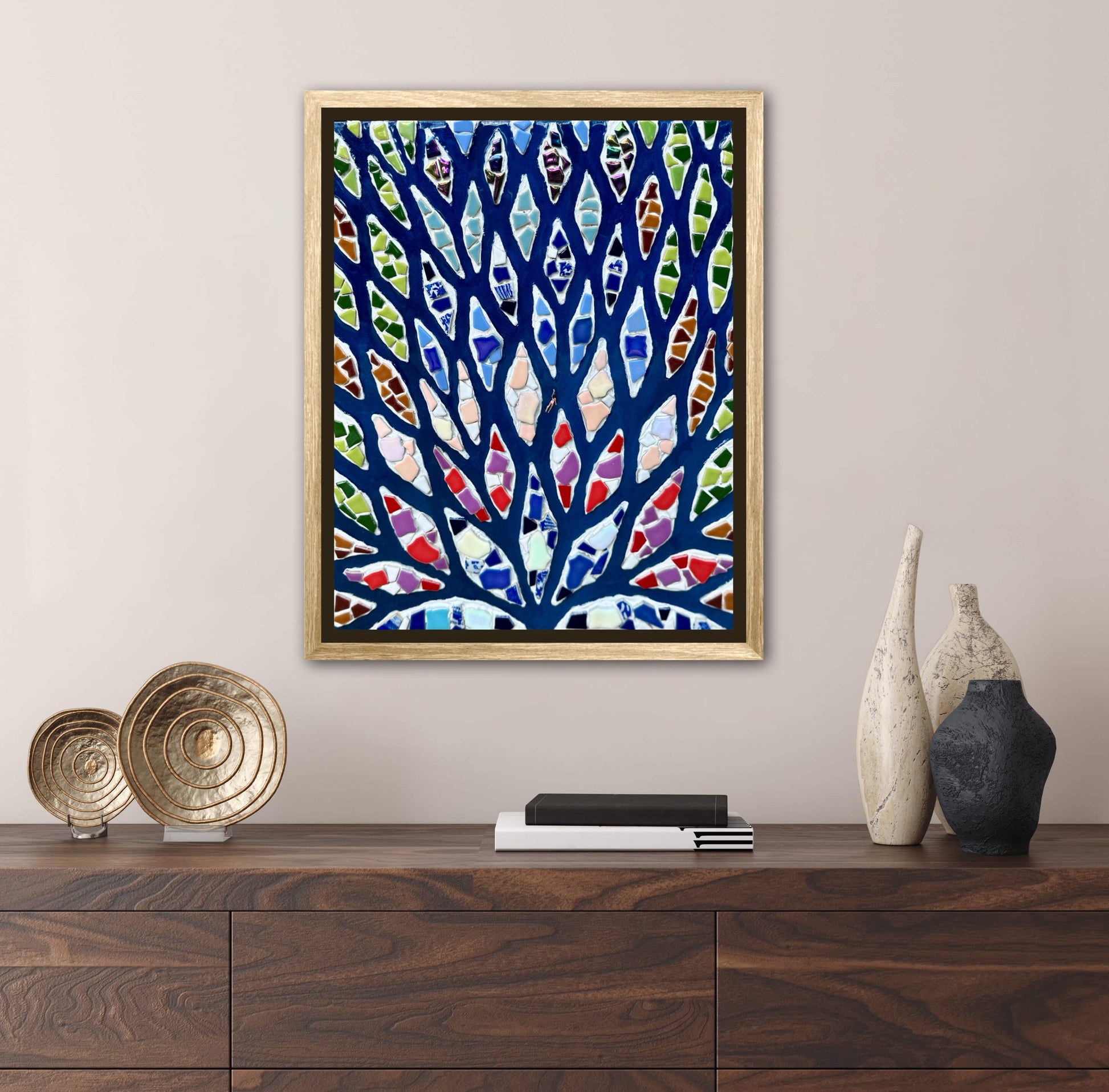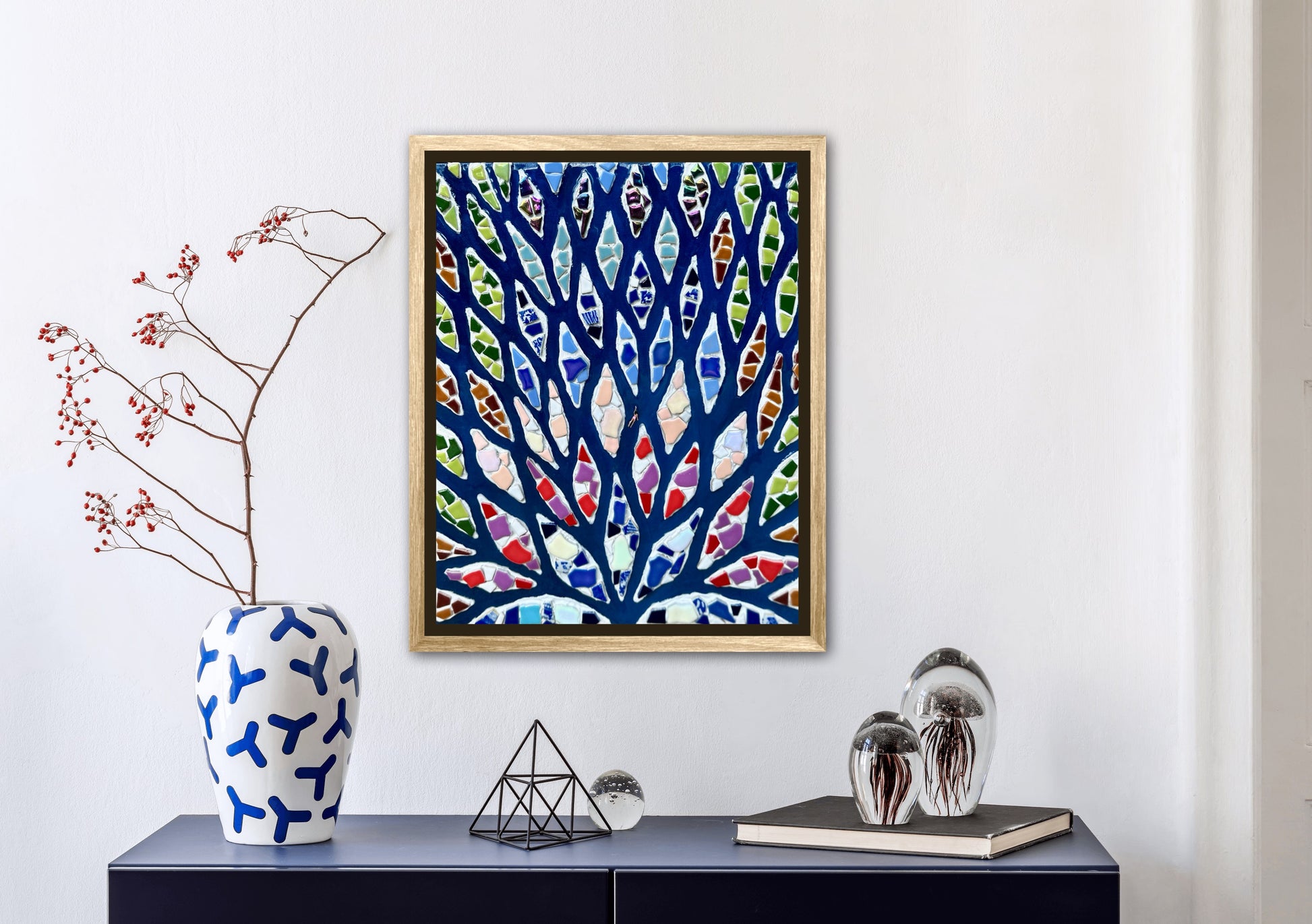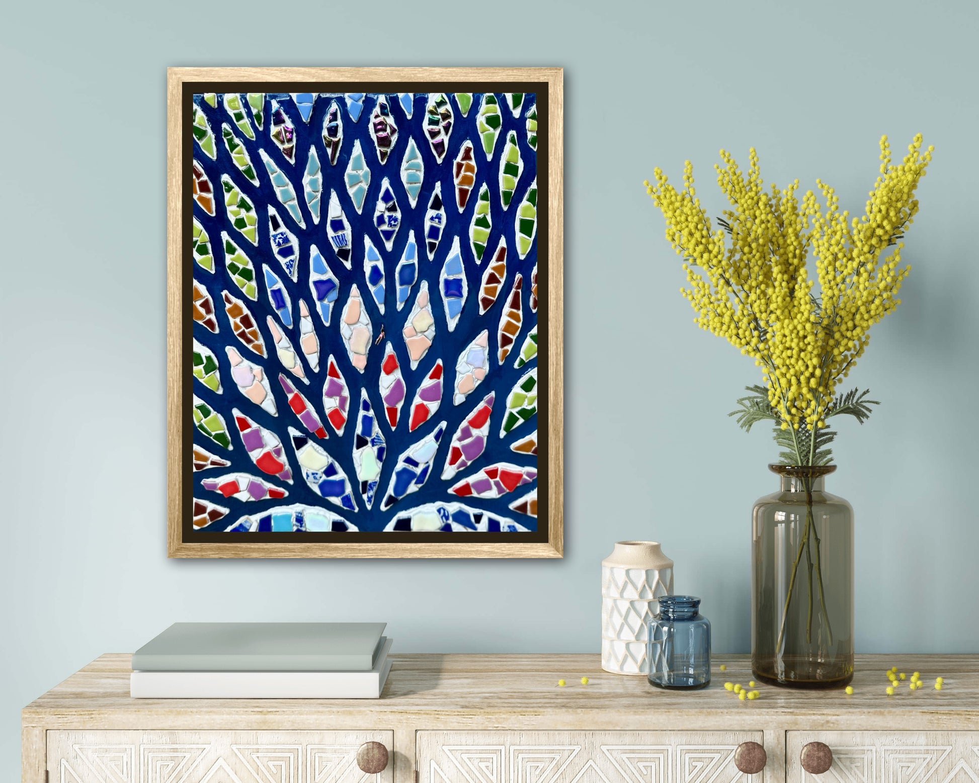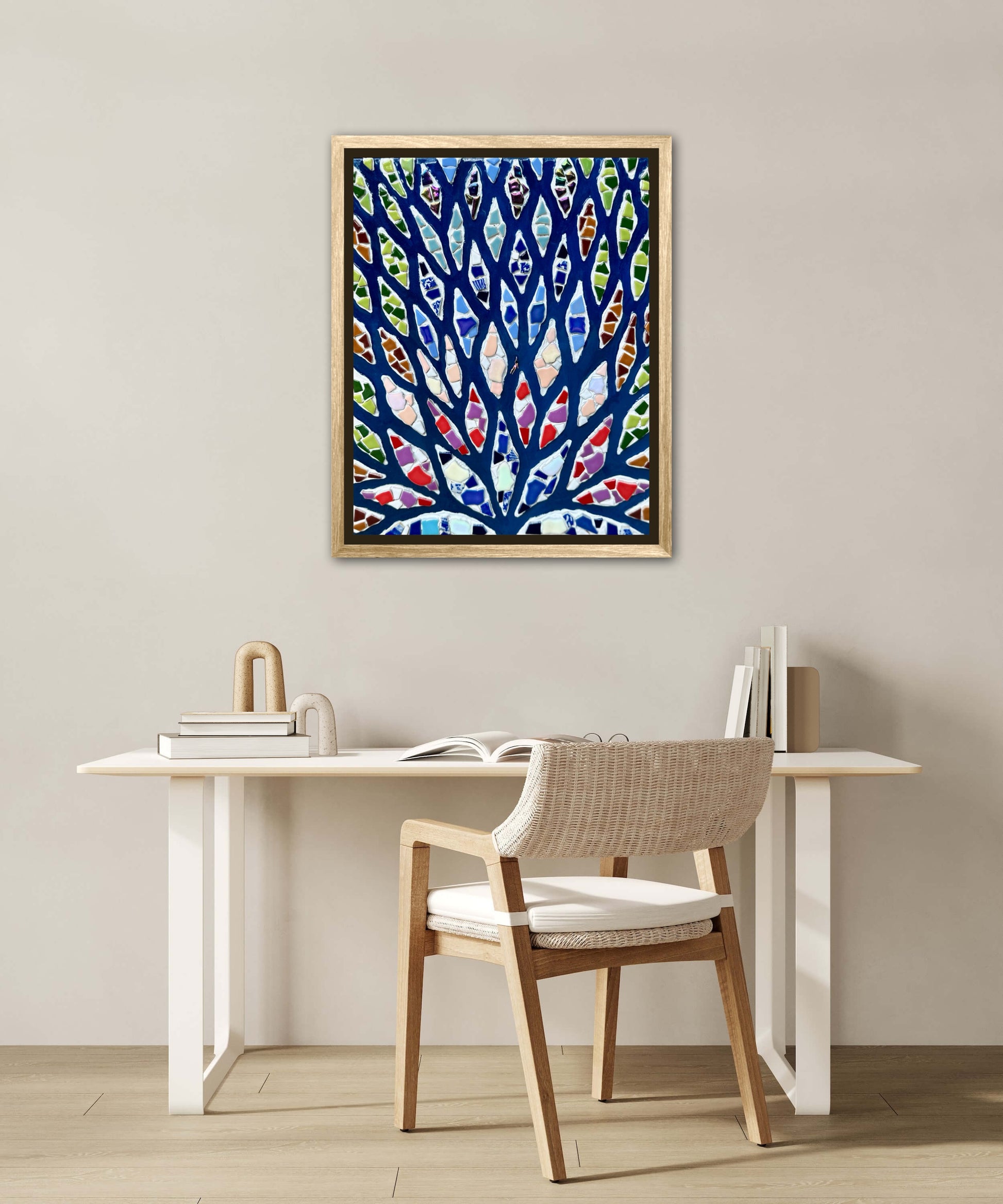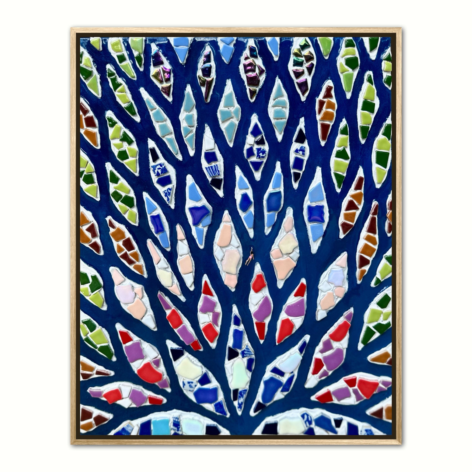 16x20in (17x21in framed) Mixed Media: sand, vibrant acrylic paint, resin, mosaic tiles, and a miniature swimmer figurine on 1.5in thick professional grade stretched canvas in a solid natural wood float frame.