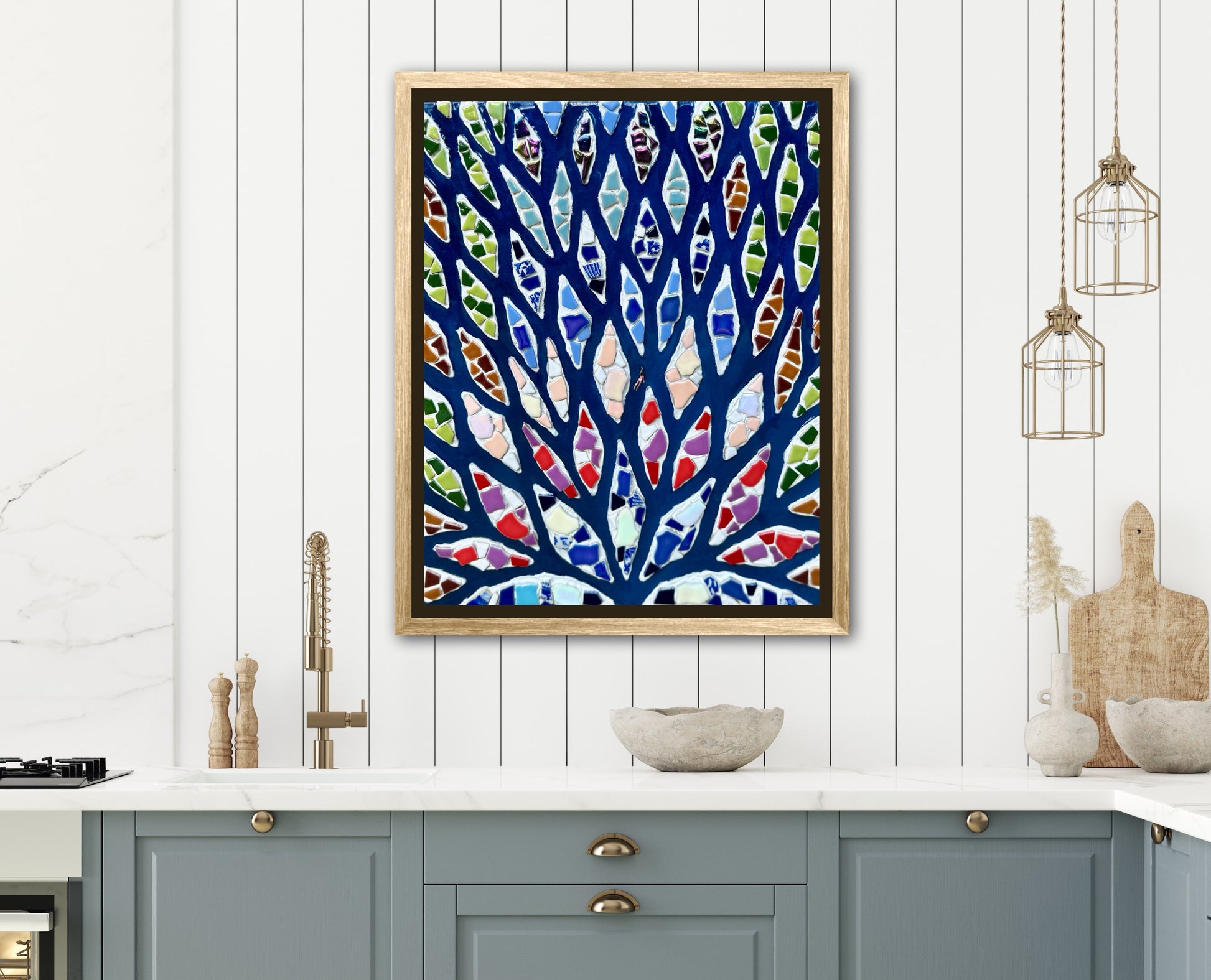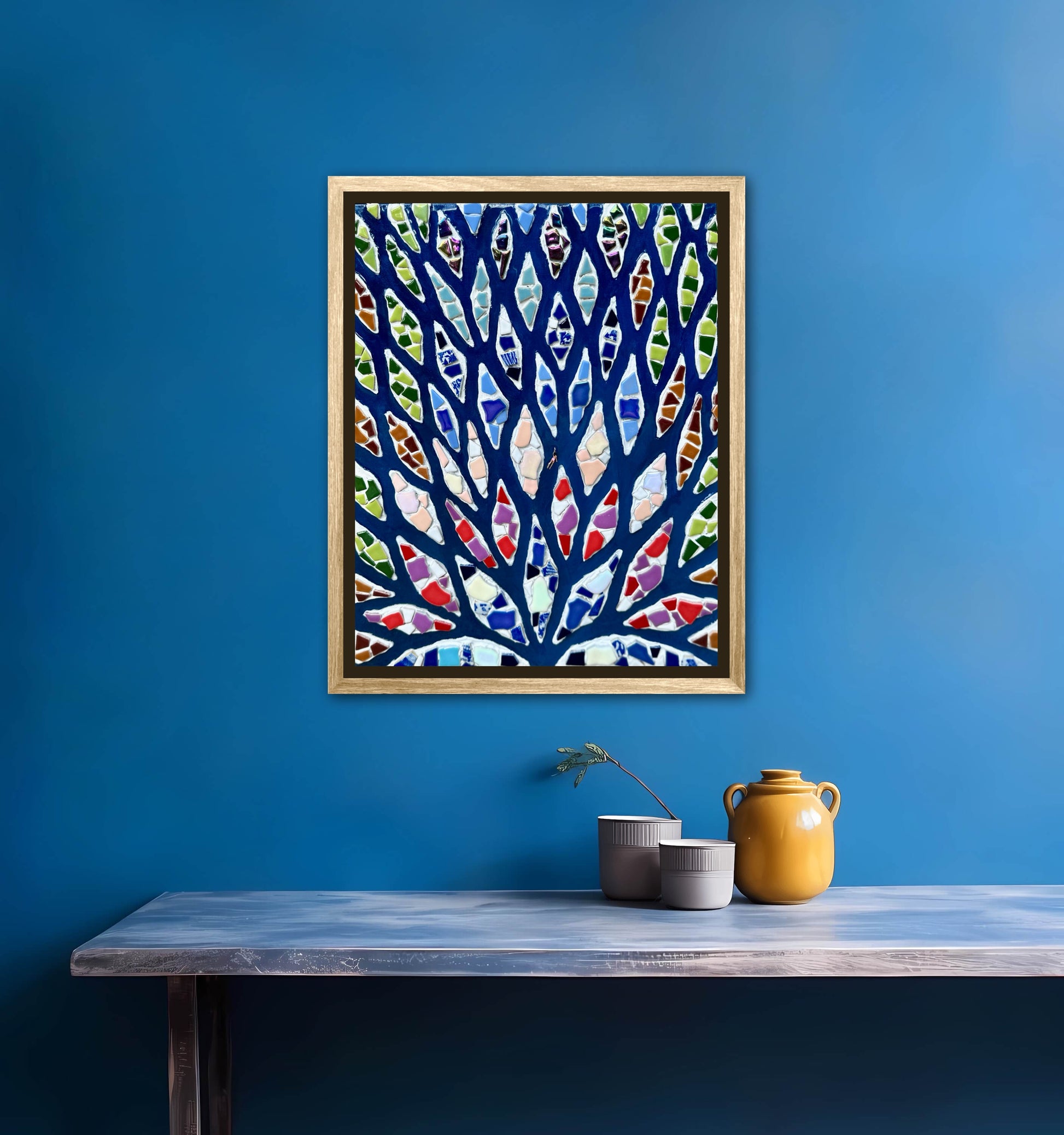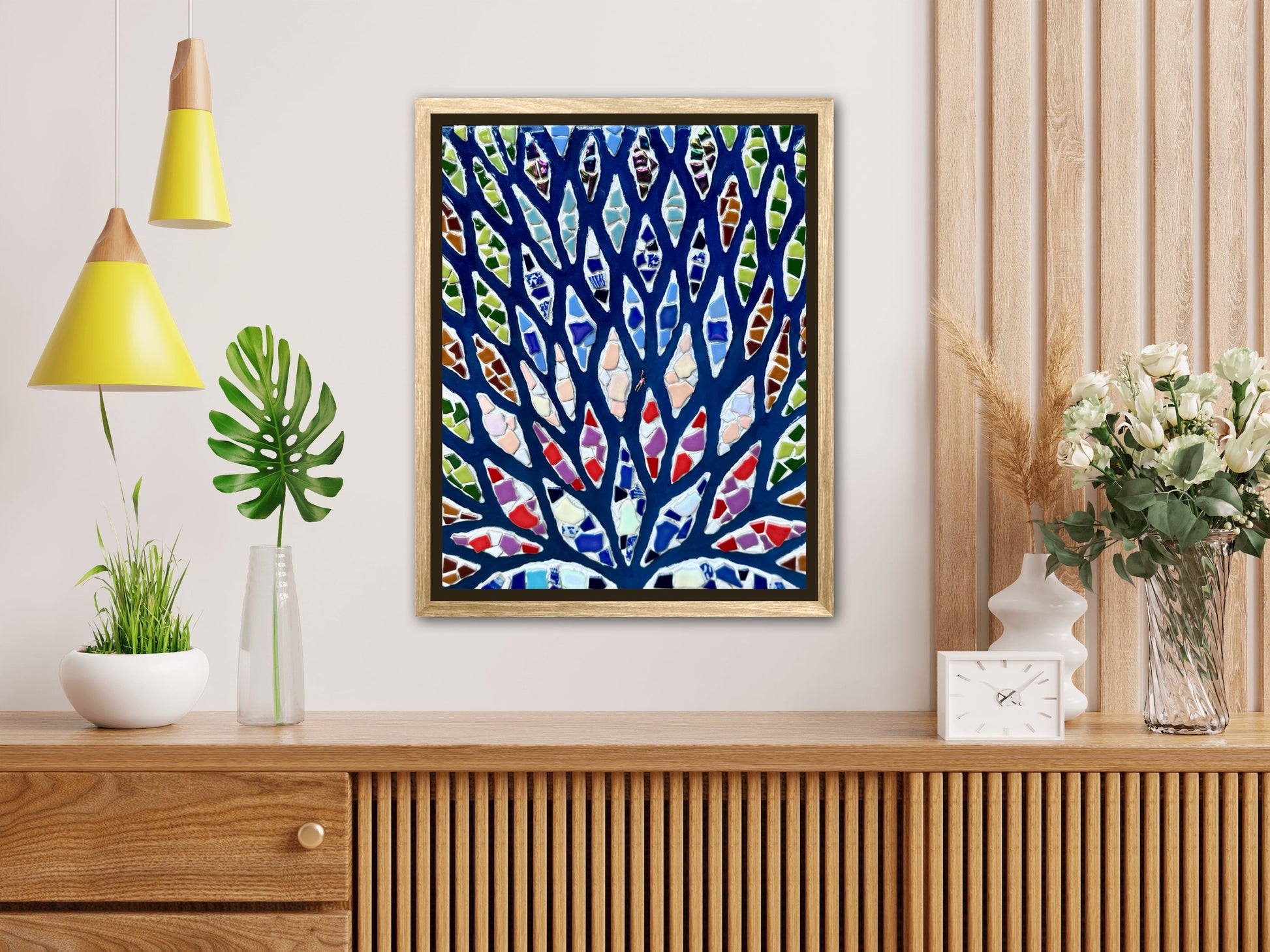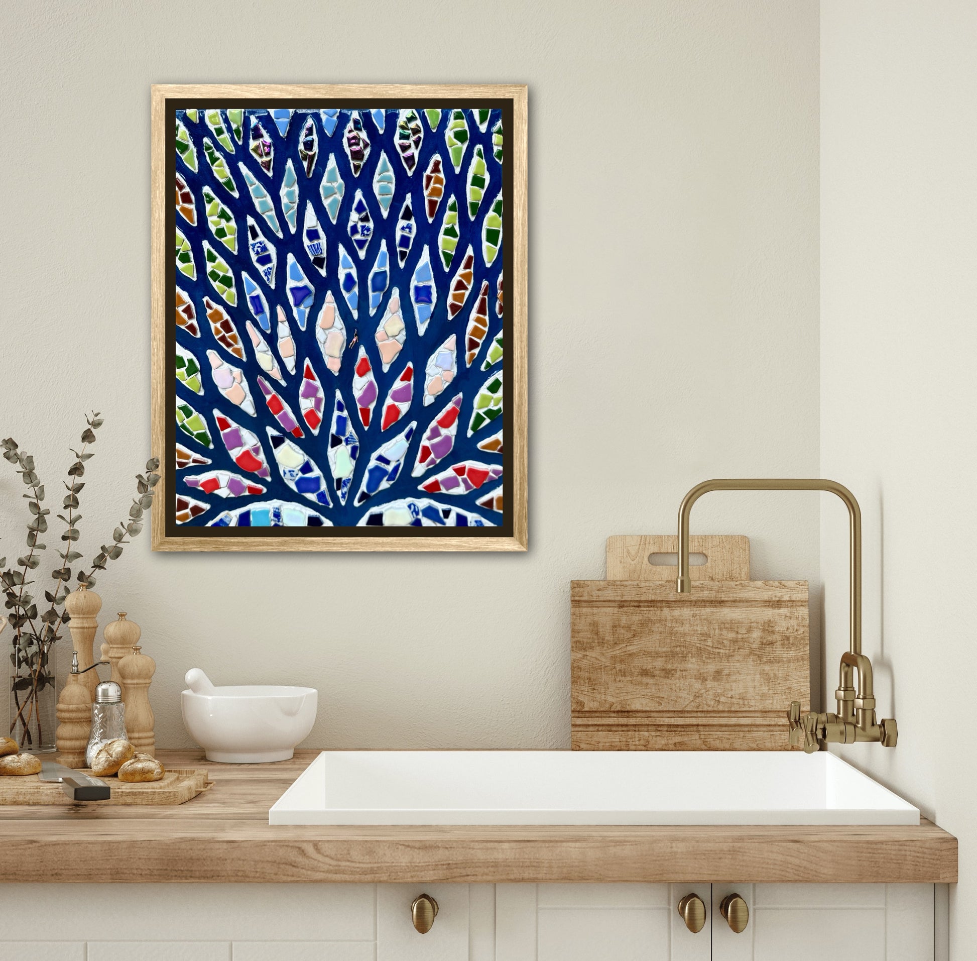 16x20in (17x21in framed) Mixed Media: sand, vibrant acrylic paint, resin, mosaic tiles, and a miniature swimmer figurine on 1.5in thick professional grade stretched canvas in a solid natural wood float frame.