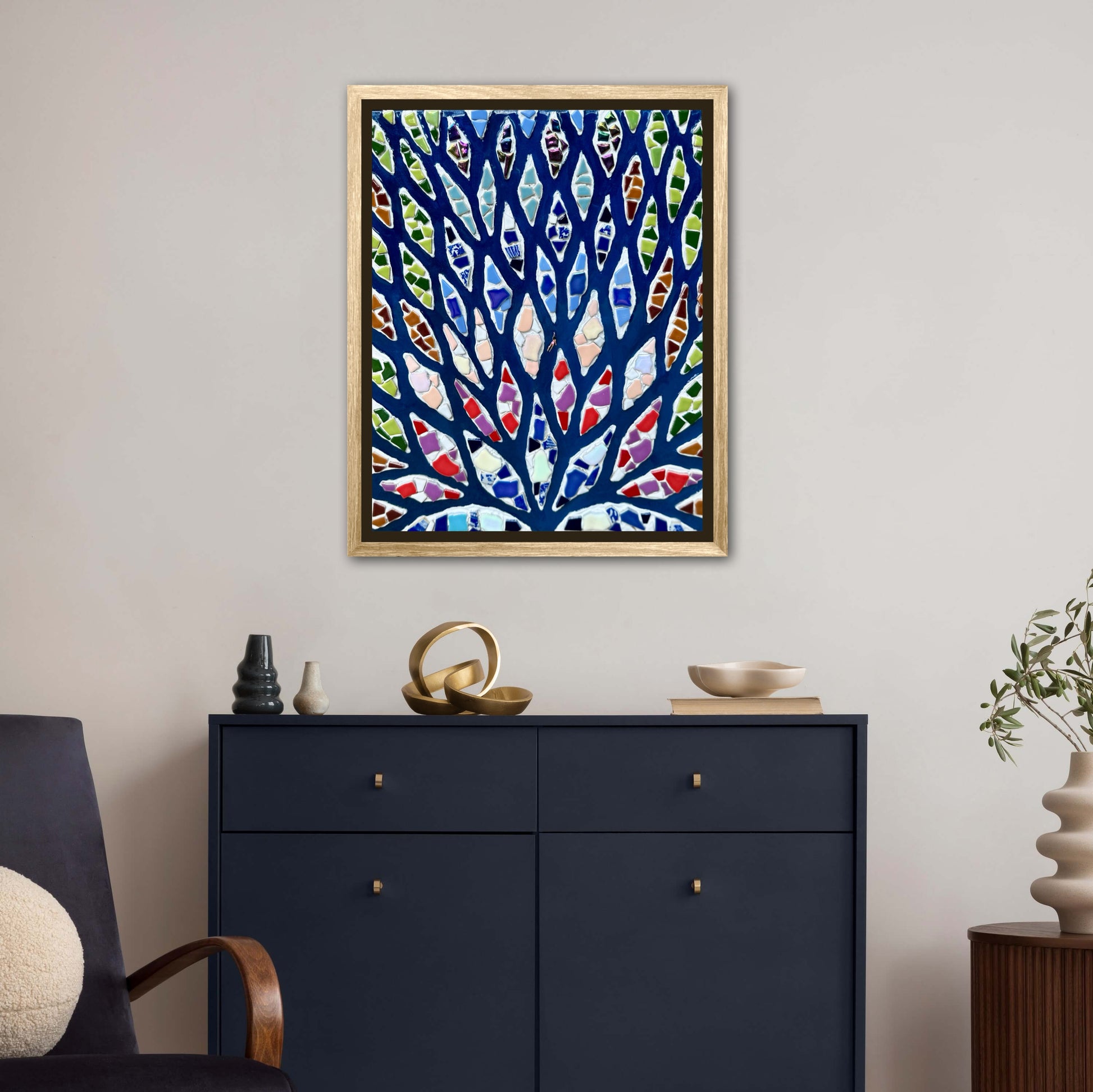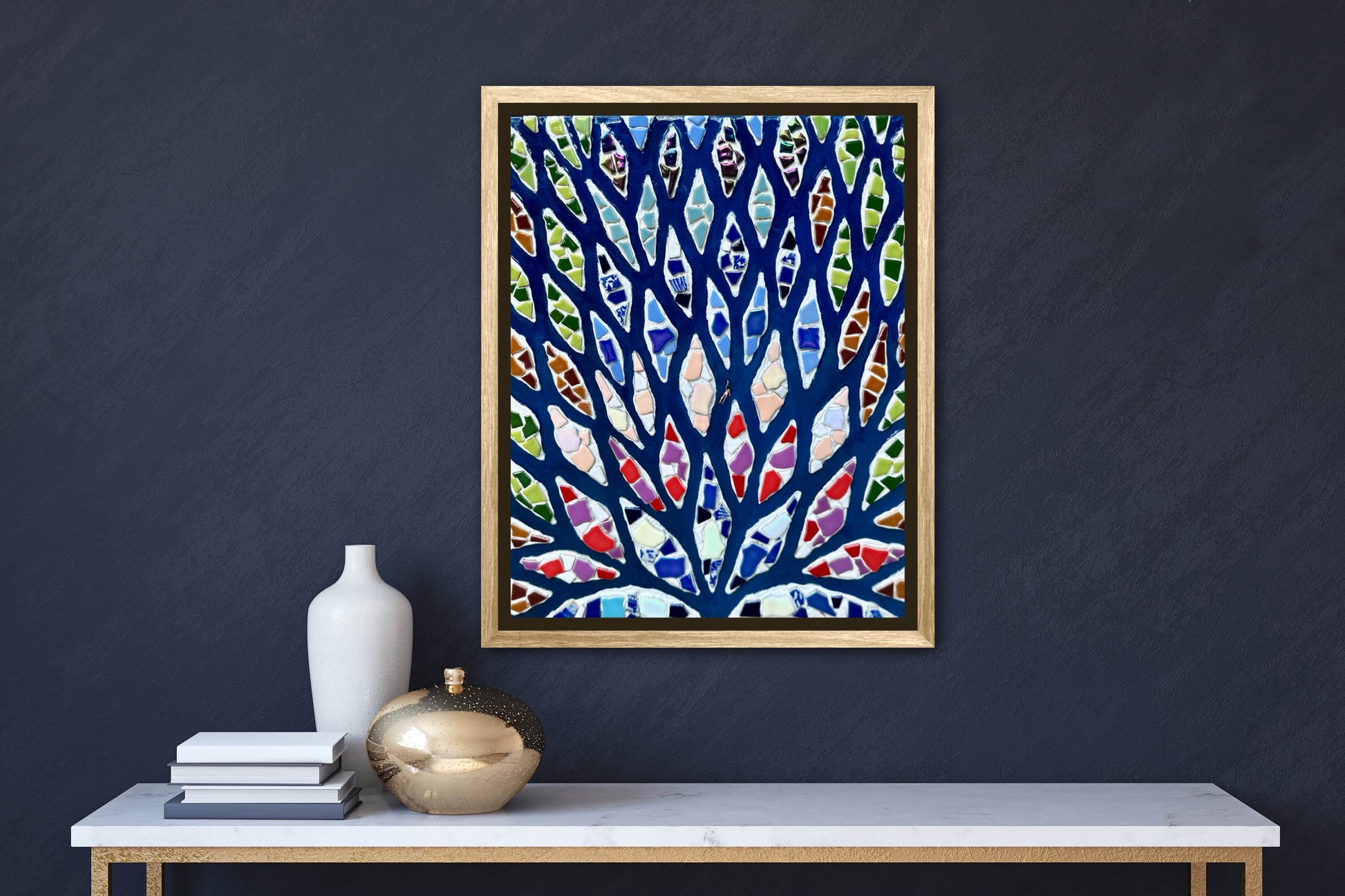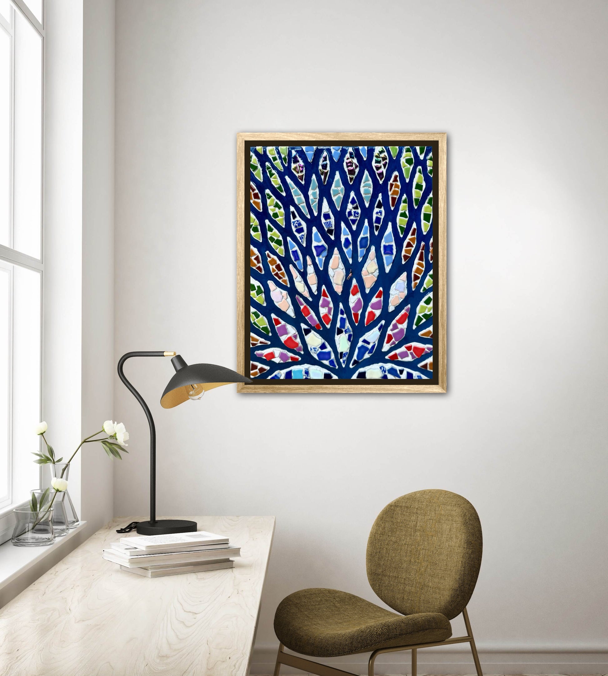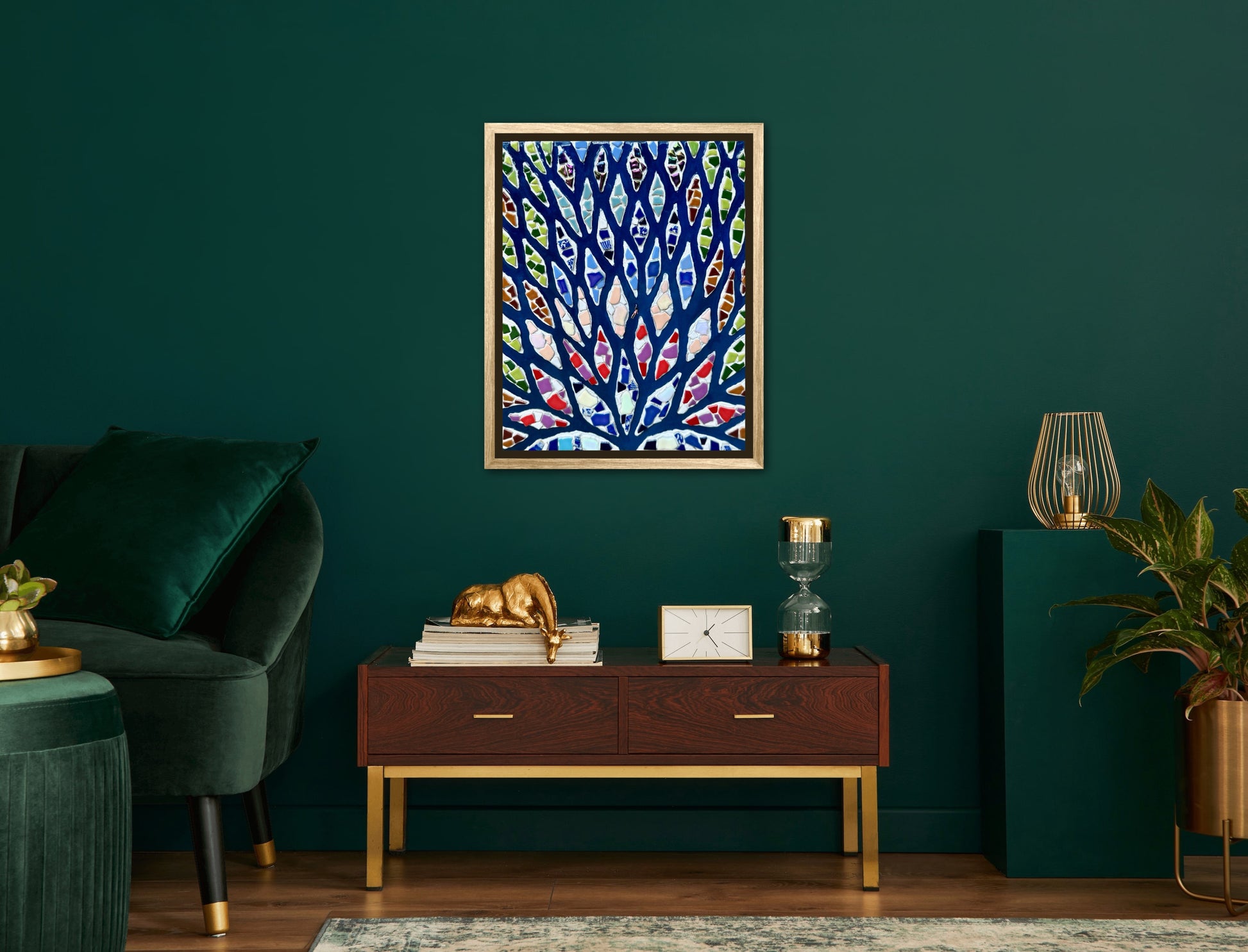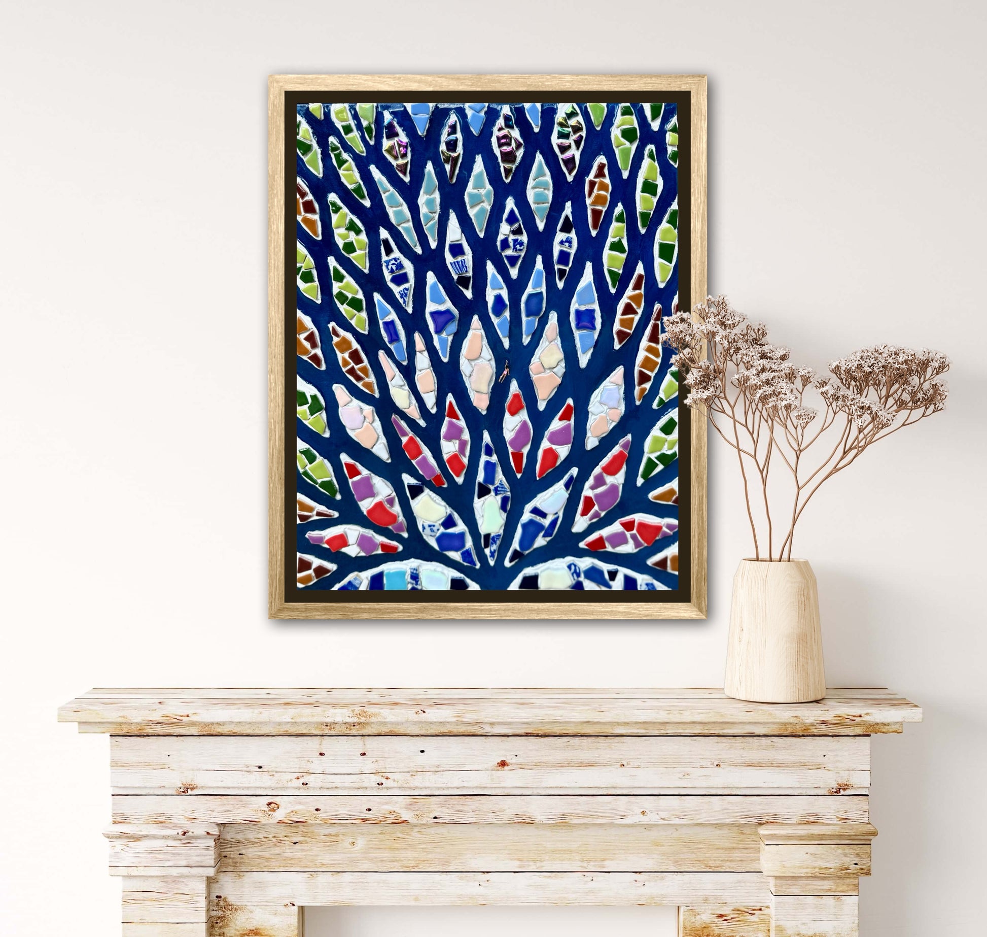 16x20in (17x21in framed) Mixed Media: sand, vibrant acrylic paint, resin, mosaic tiles, and a miniature swimmer figurine on 1.5in thick professional grade stretched canvas in a solid natural wood float frame.
