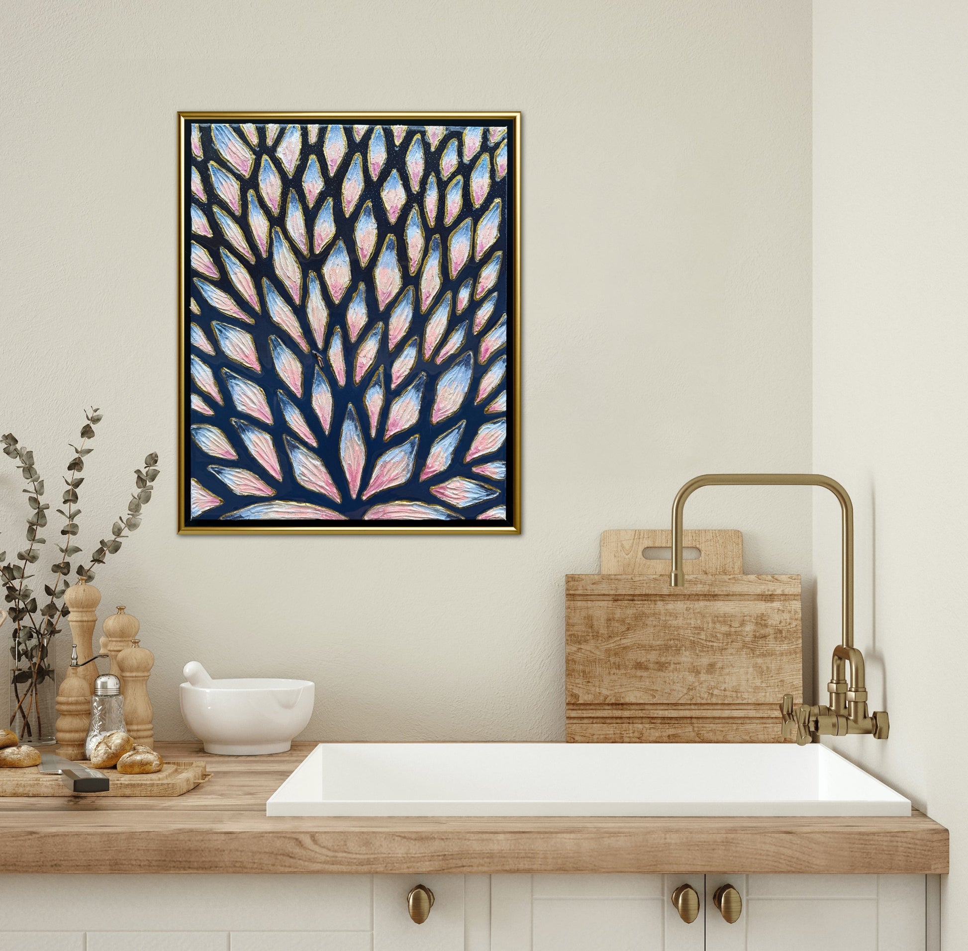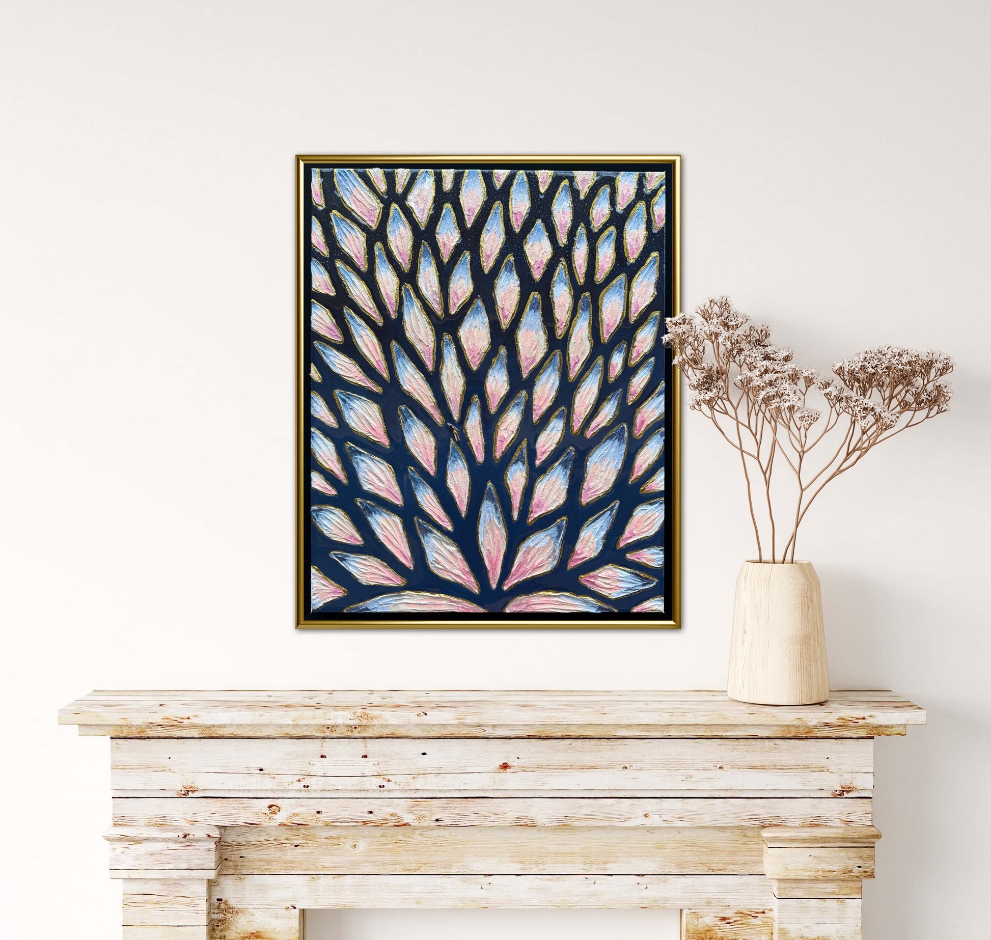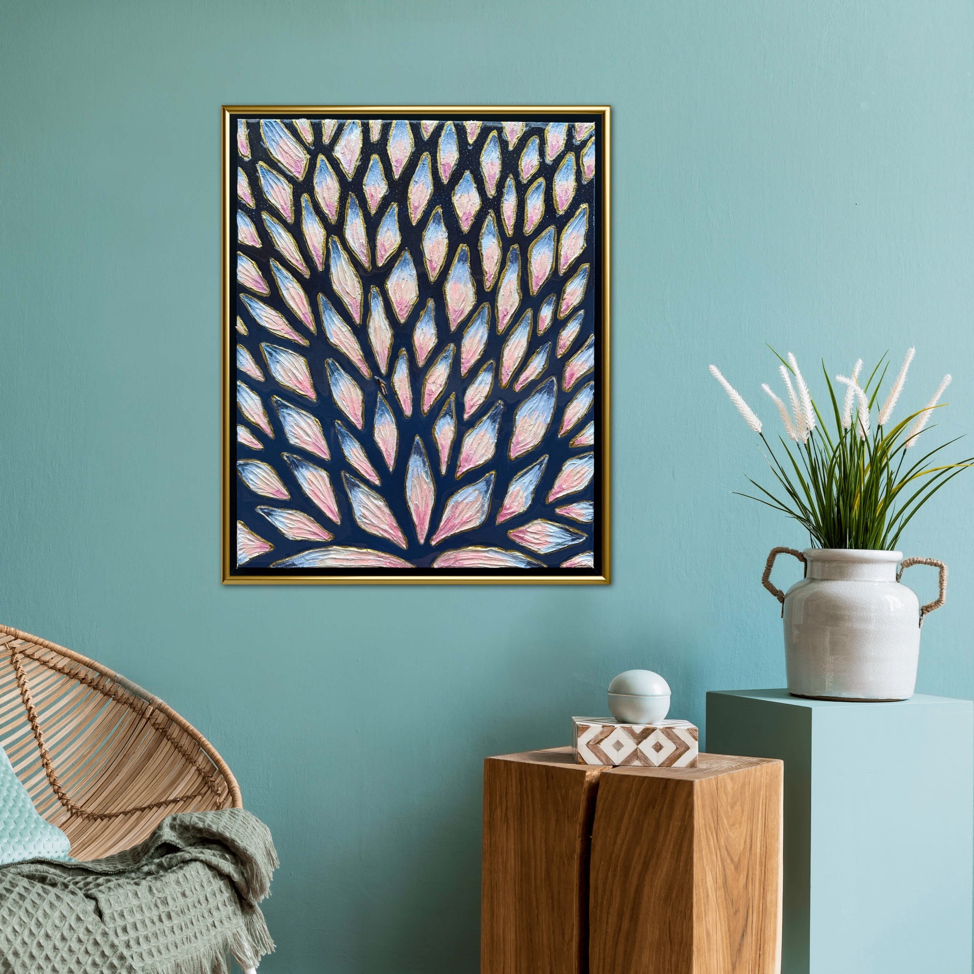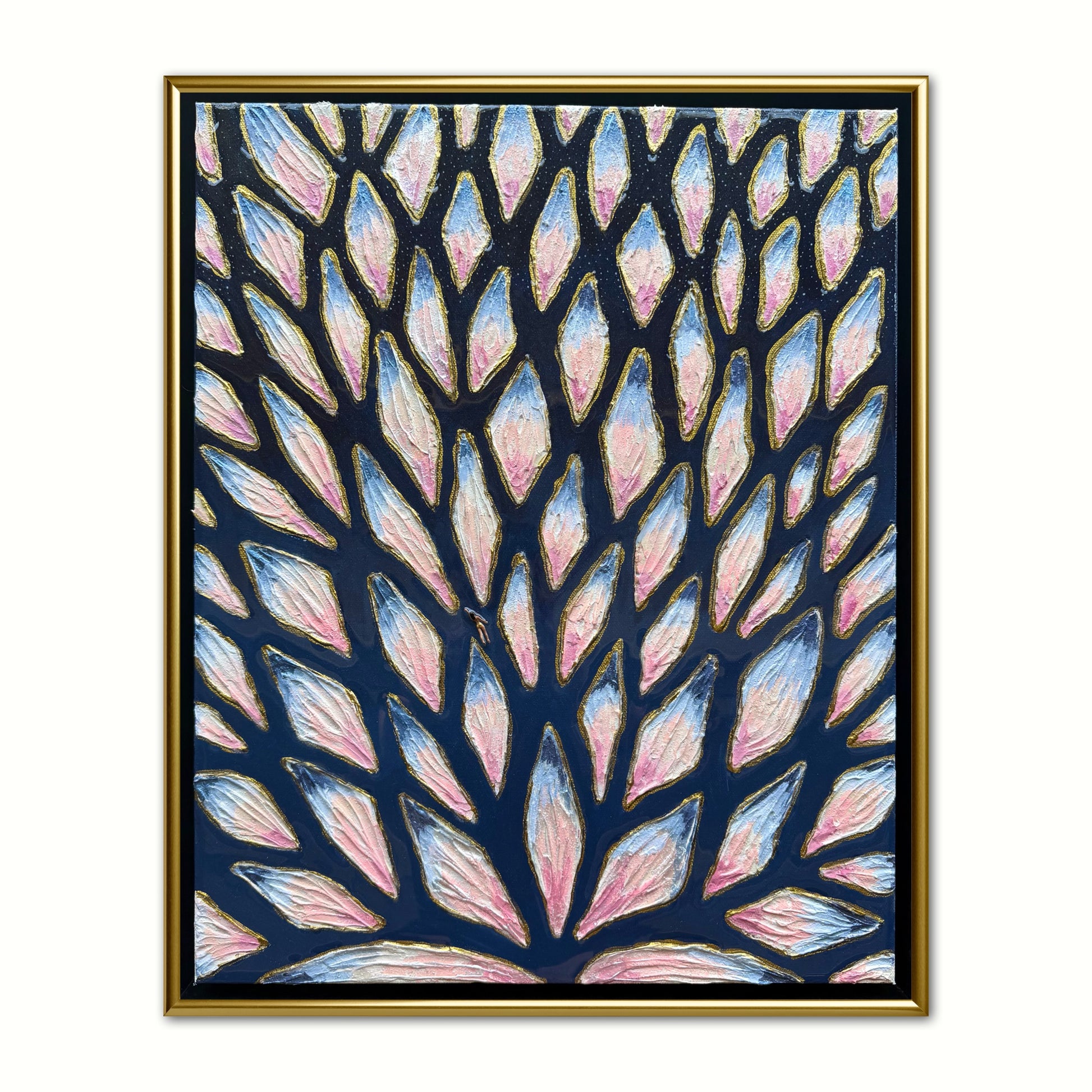16x20in (17x21in framed) Mixed Media: sand, vibrant acrylic paint, resin, mosaic tiles, and a miniature swimmer figurine on 1.5in thick professional grade stretched canvas in a solid natural wood float frame.