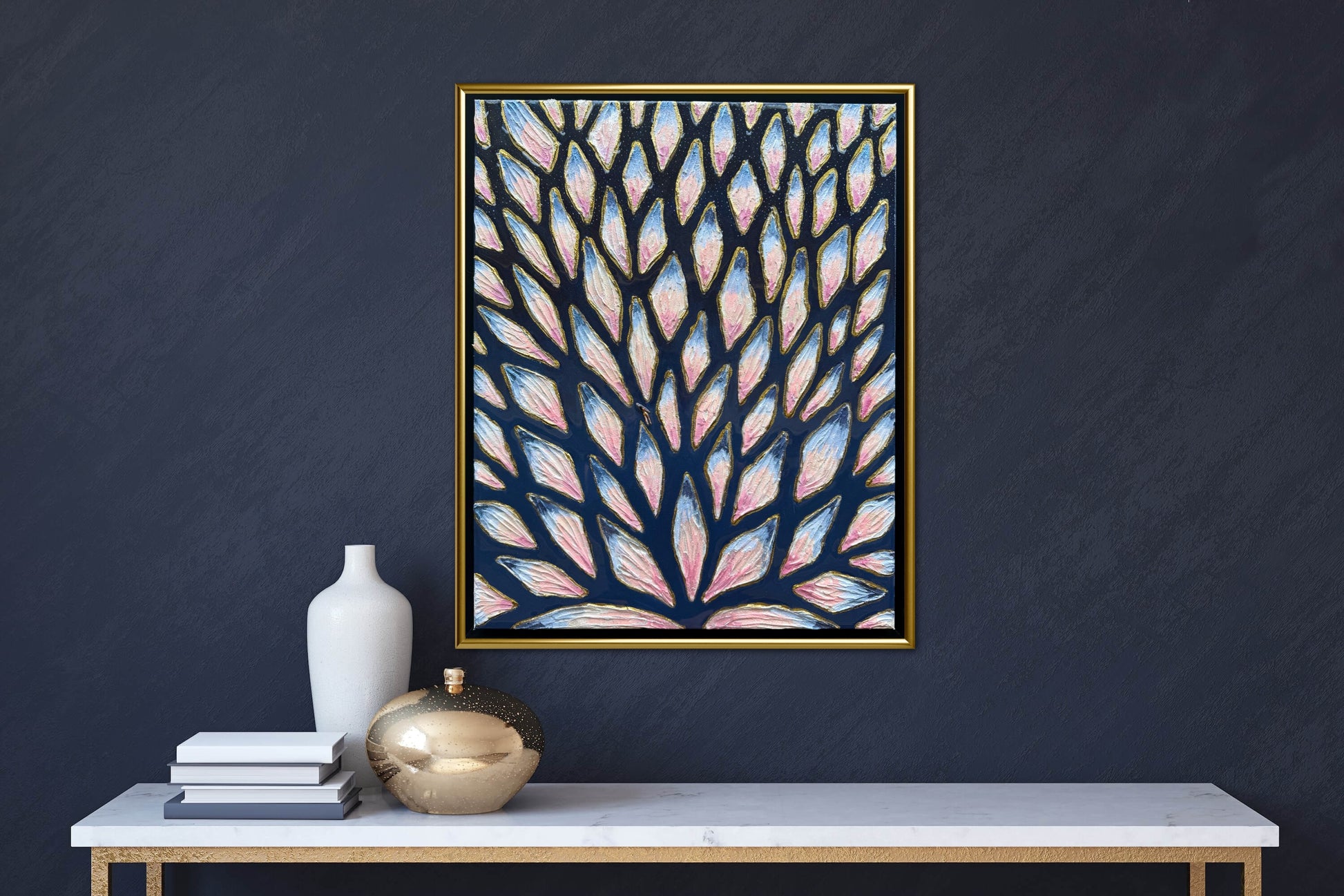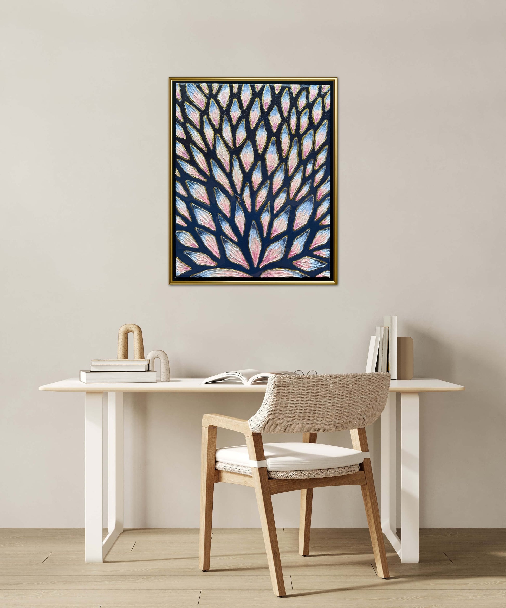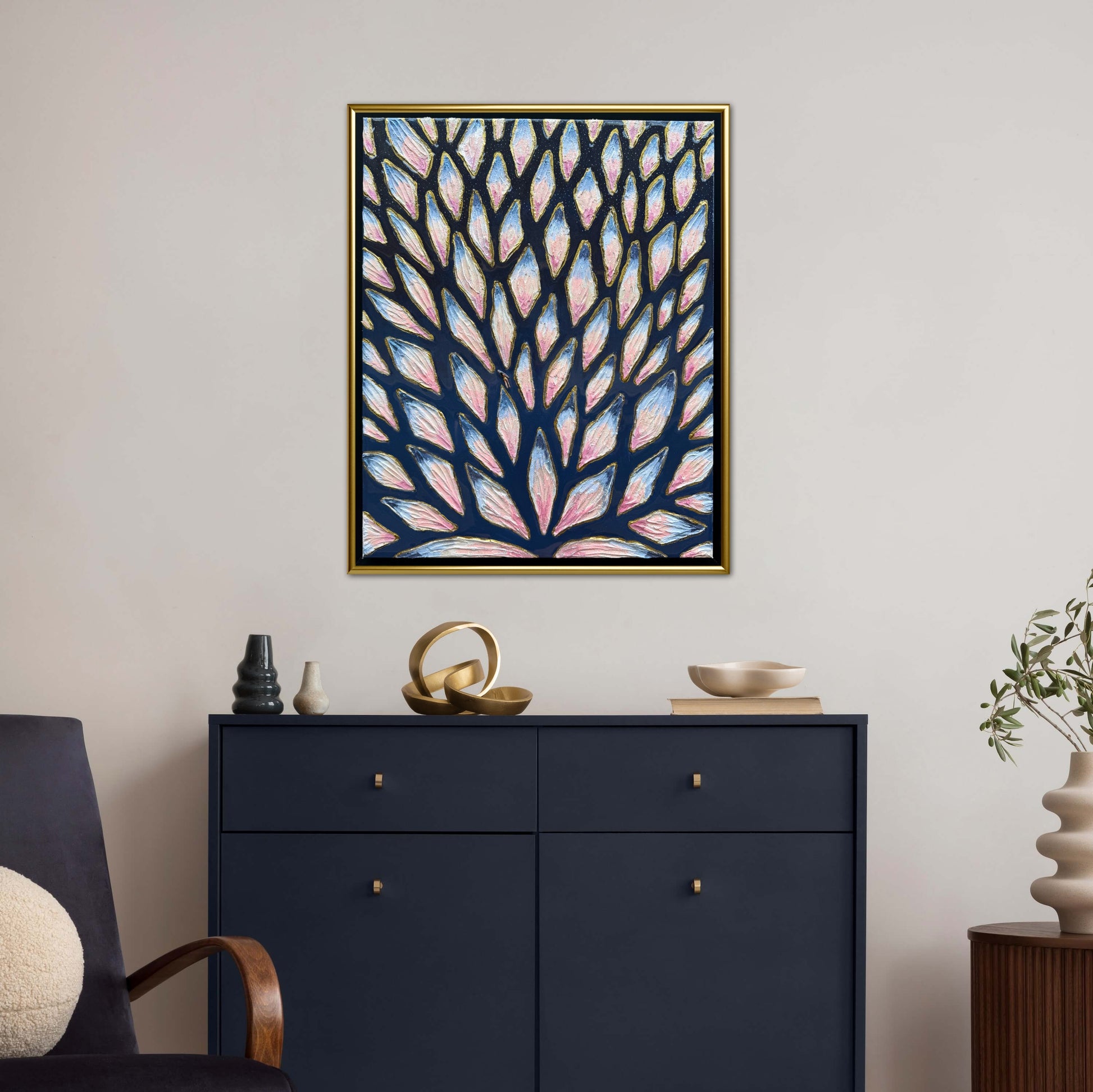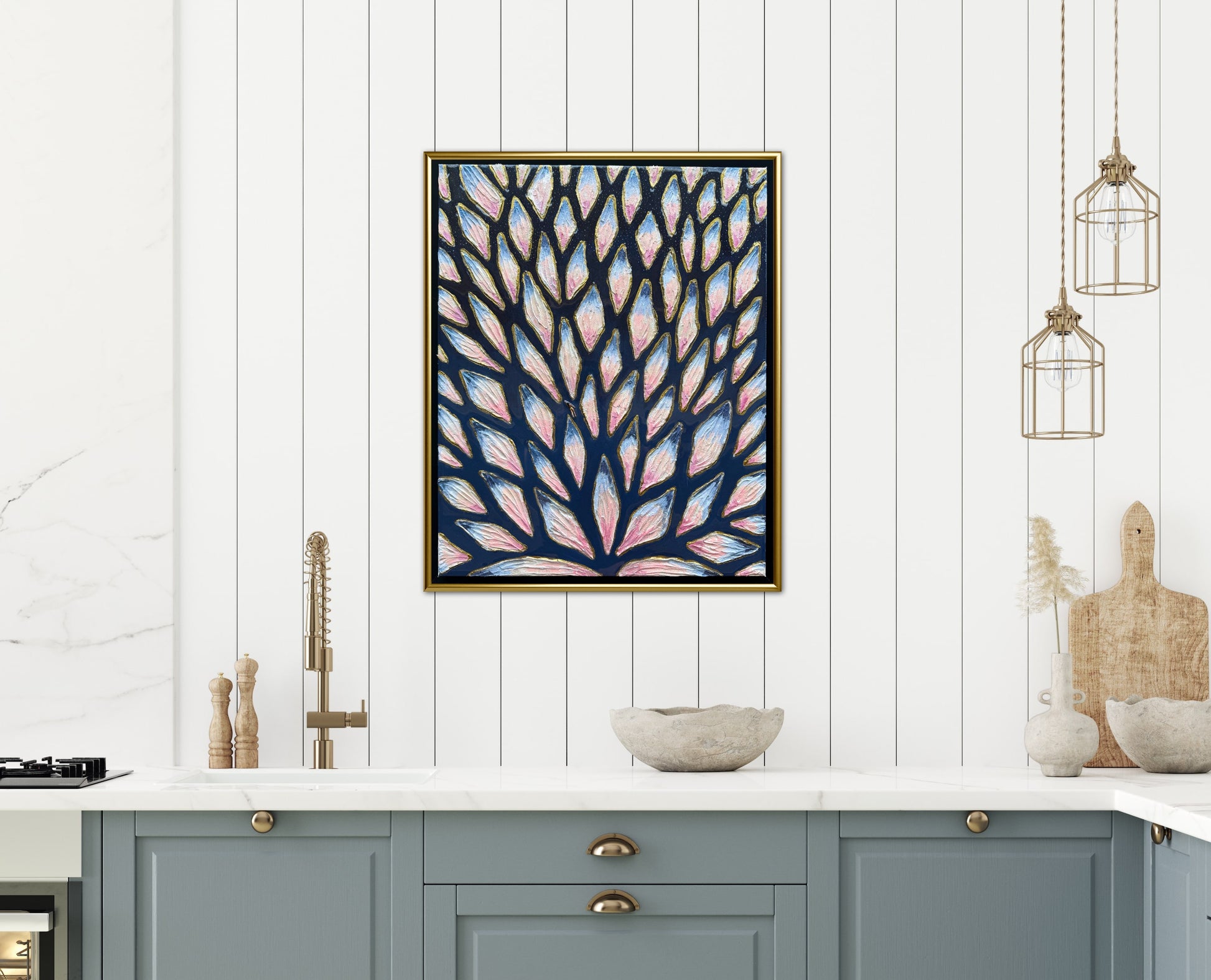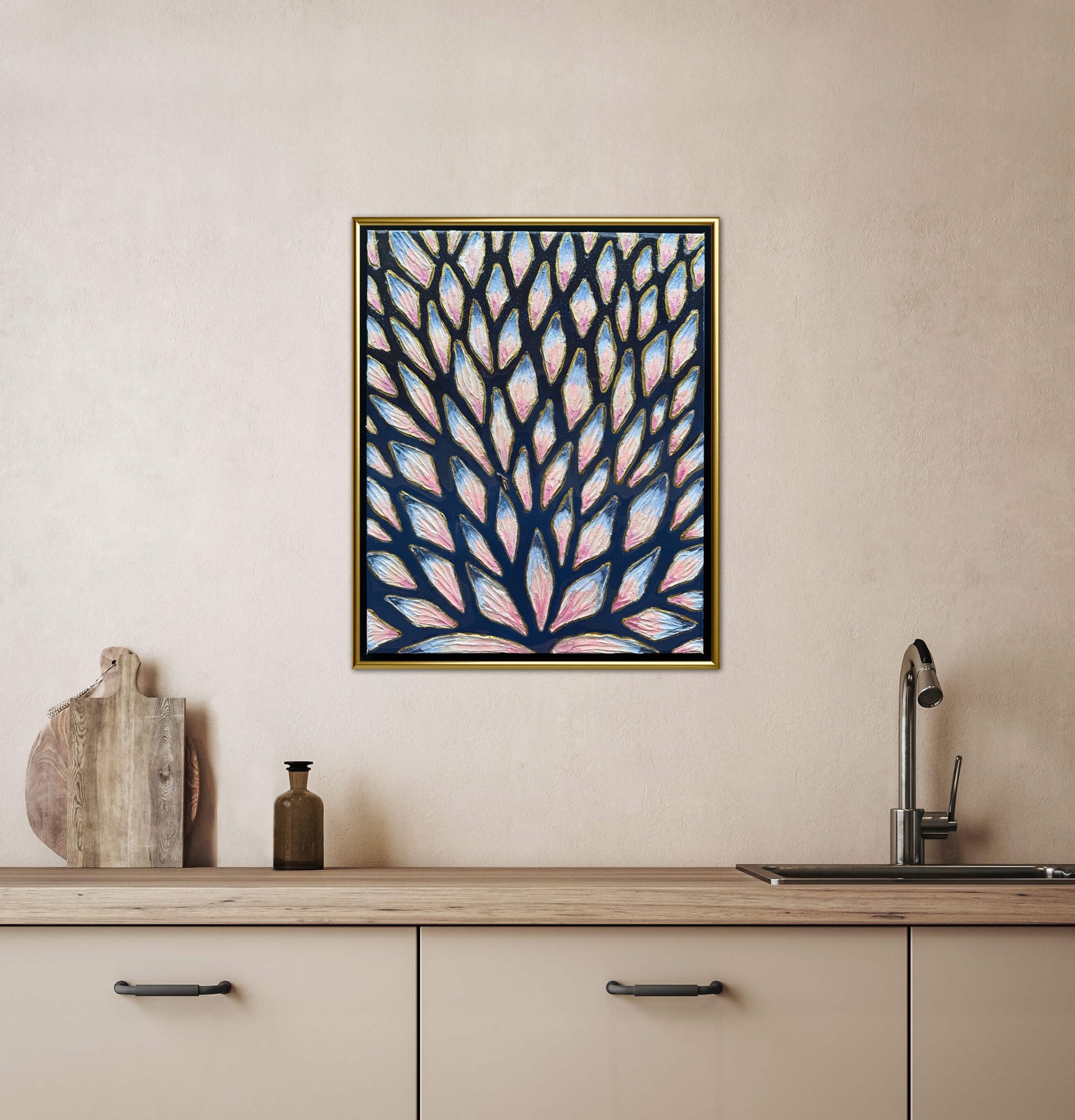 16x20in (17x21in framed) Mixed Media: sand, vibrant acrylic paint, resin, mosaic tiles, and a miniature swimmer figurine on 1.5in thick professional grade stretched canvas in a solid natural wood float frame.