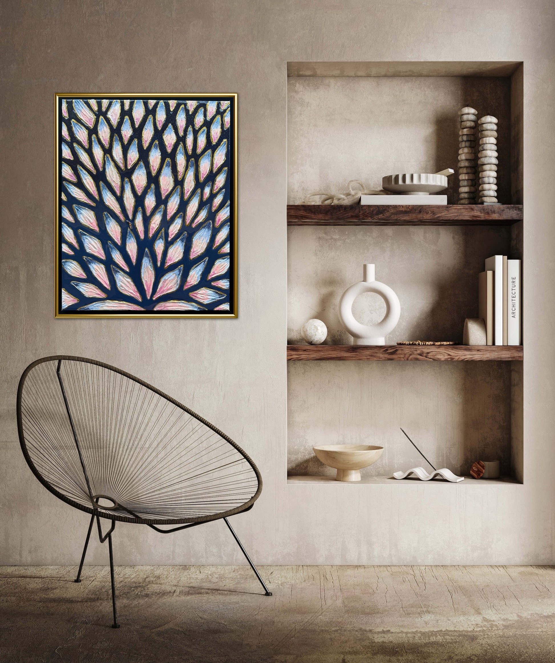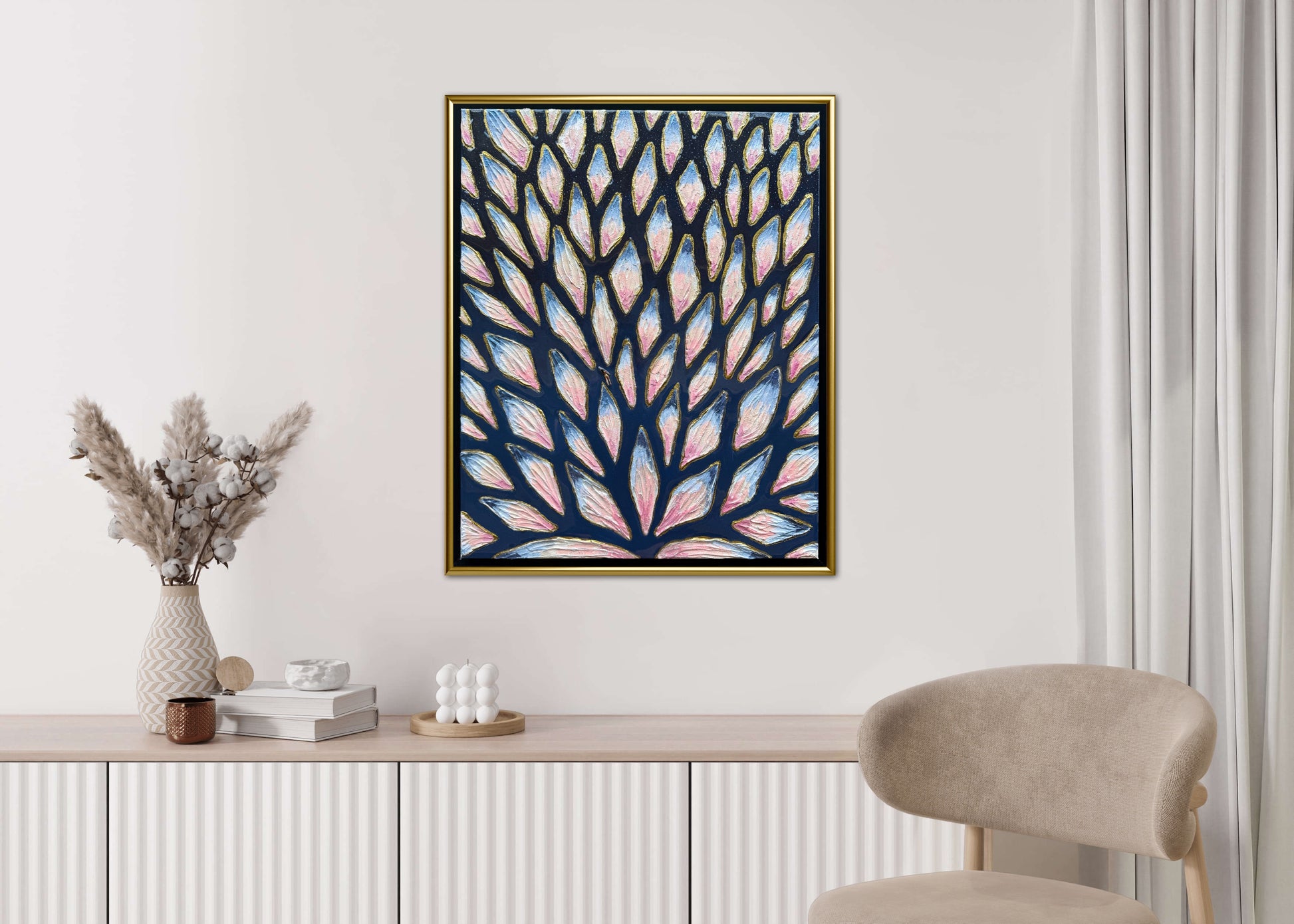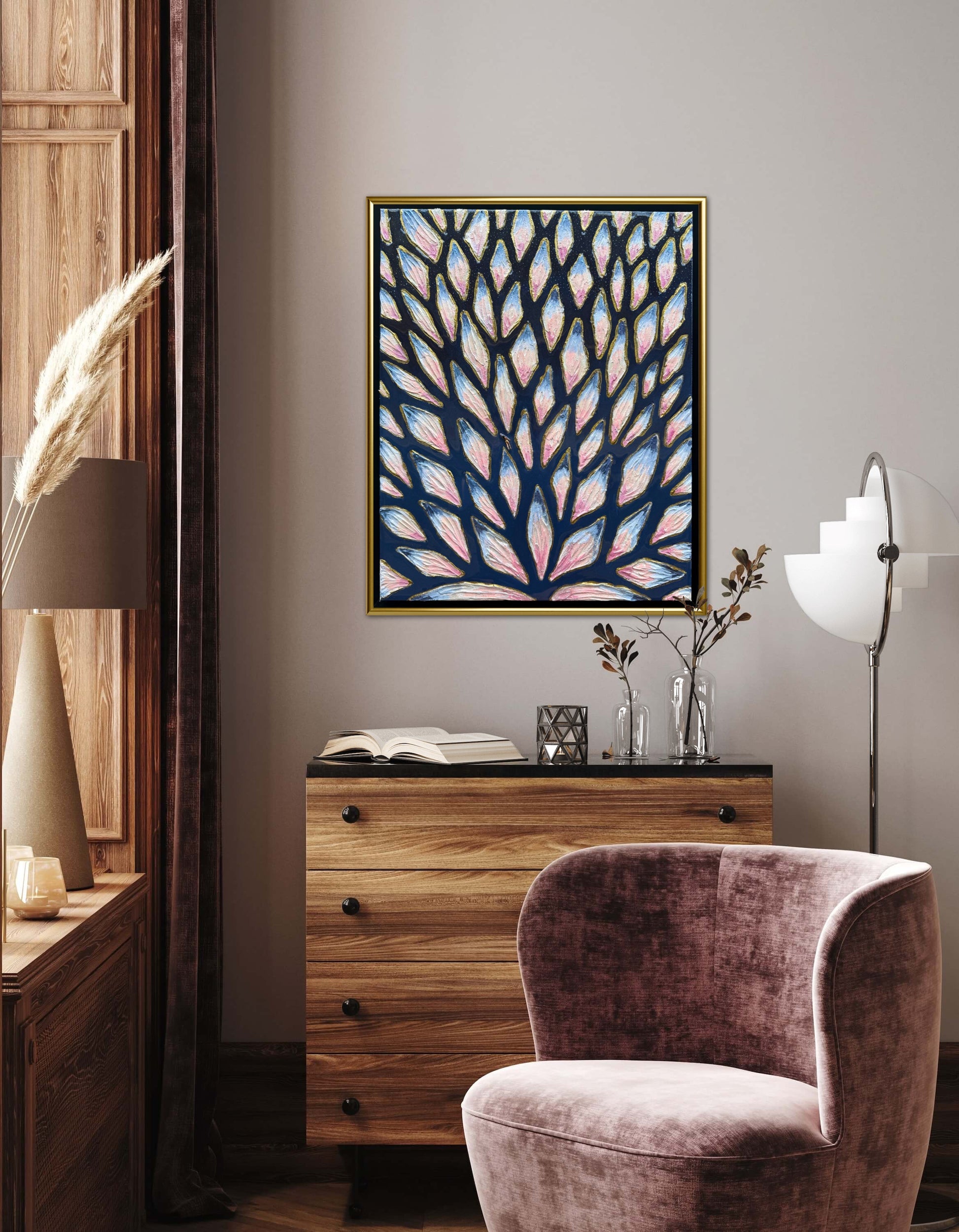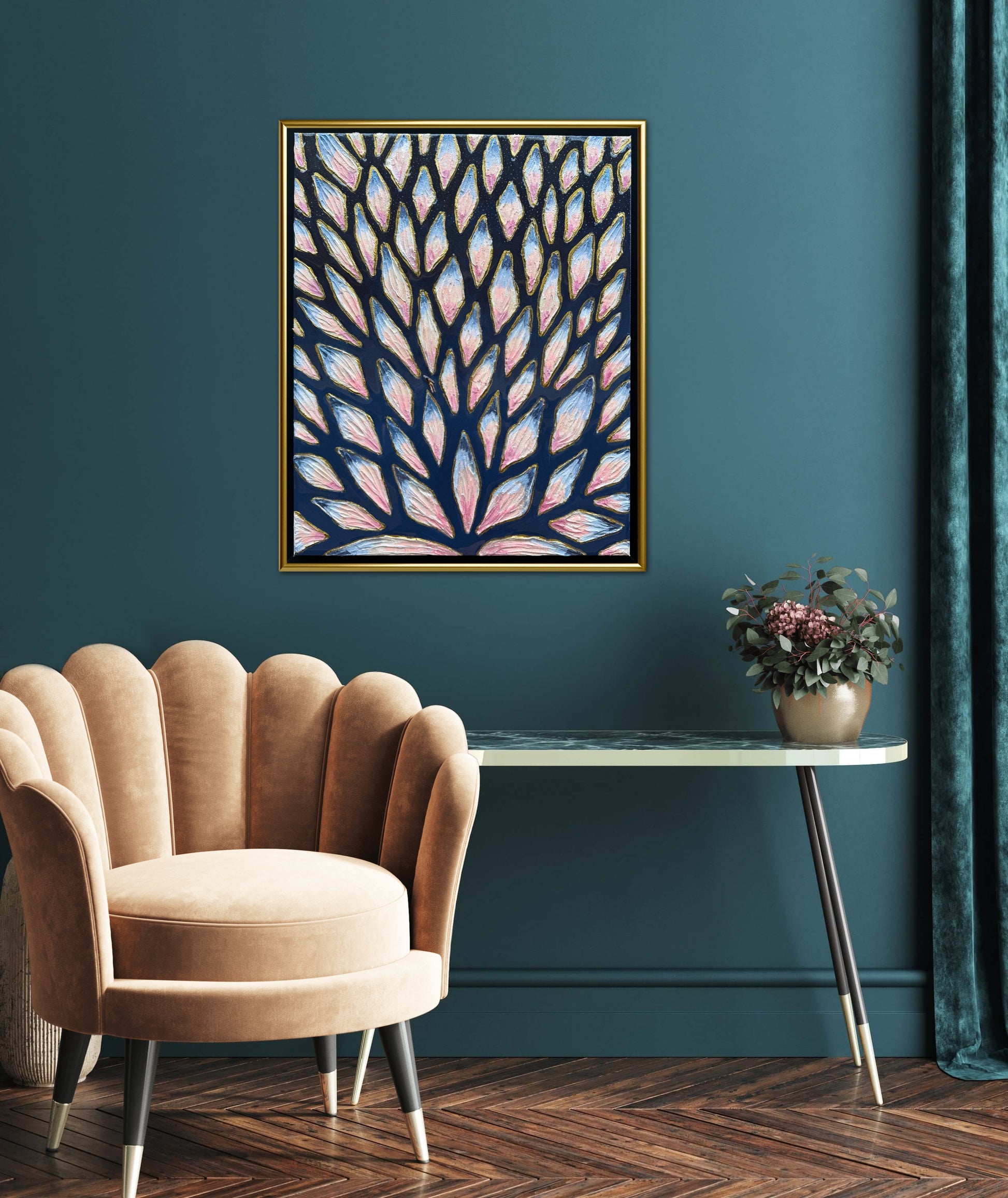 16x20in (17x21in framed) Mixed Media: sand, vibrant acrylic paint, resin, mosaic tiles, and a miniature swimmer figurine on 1.5in thick professional grade stretched canvas in a solid natural wood float frame.
