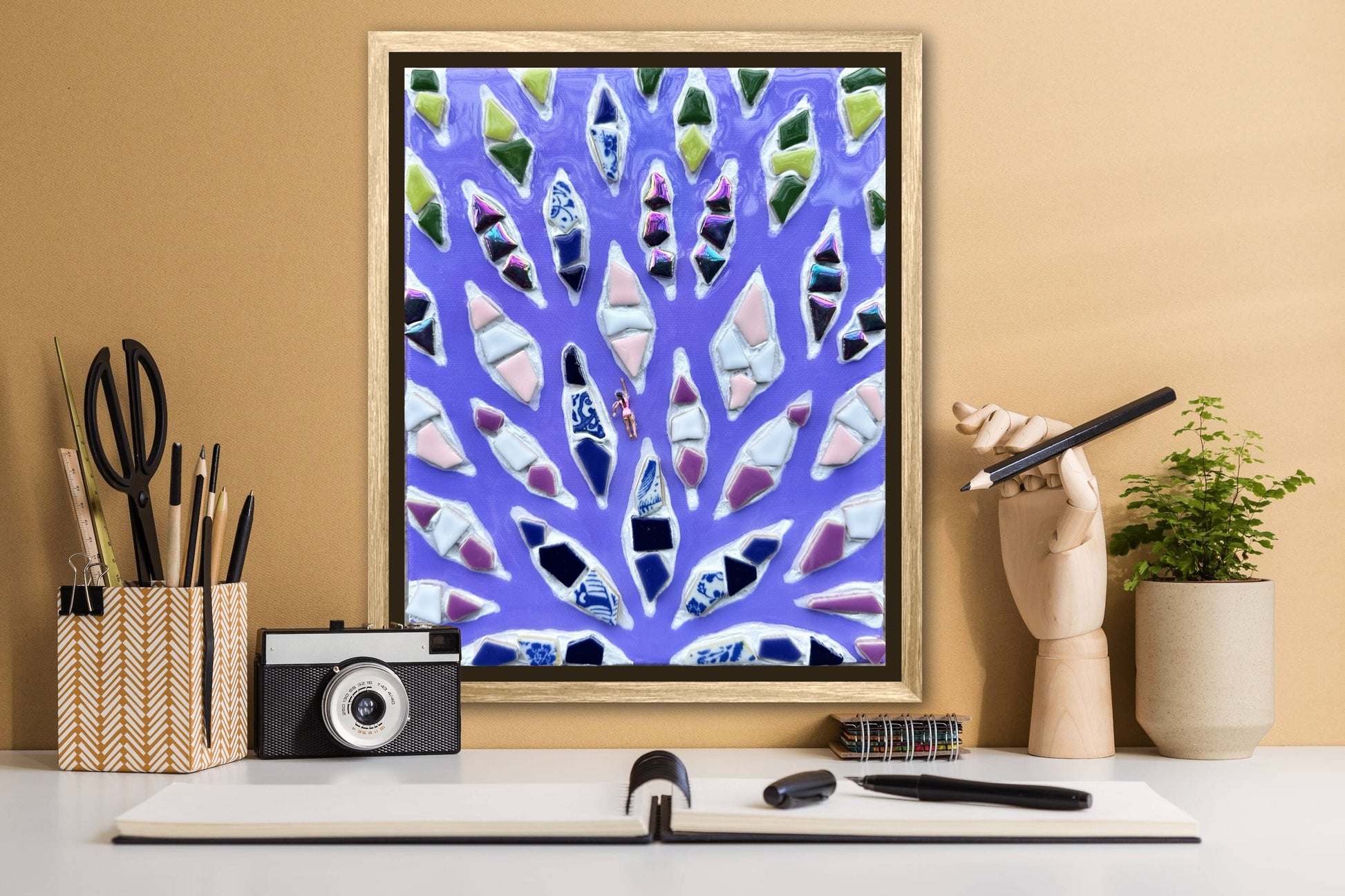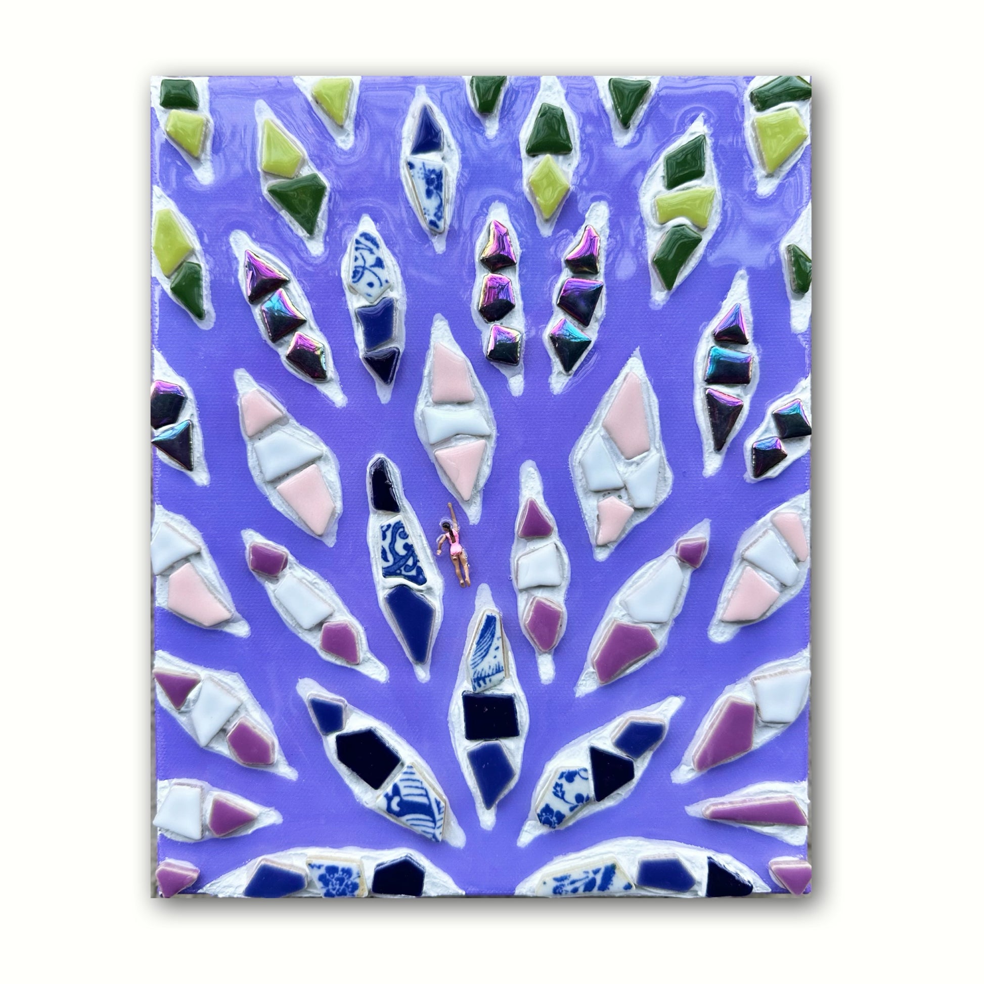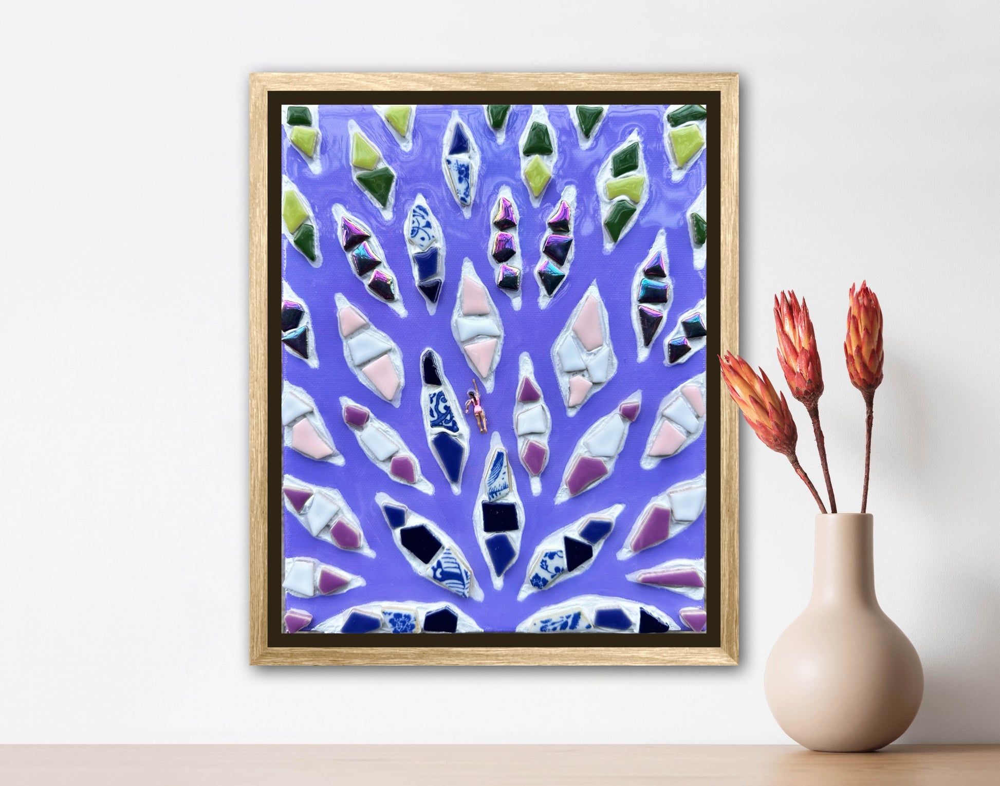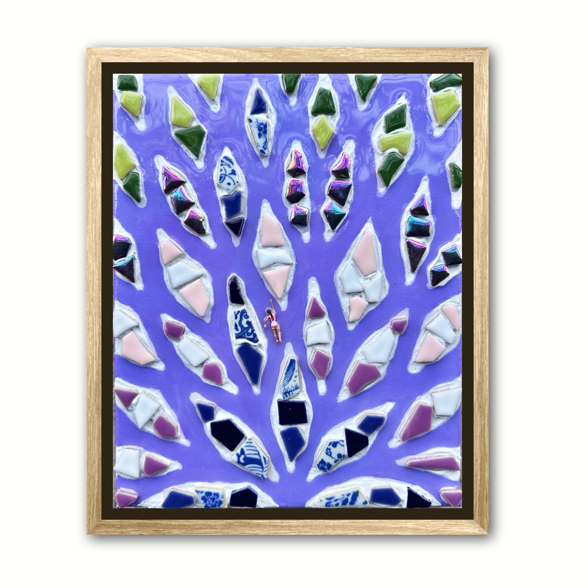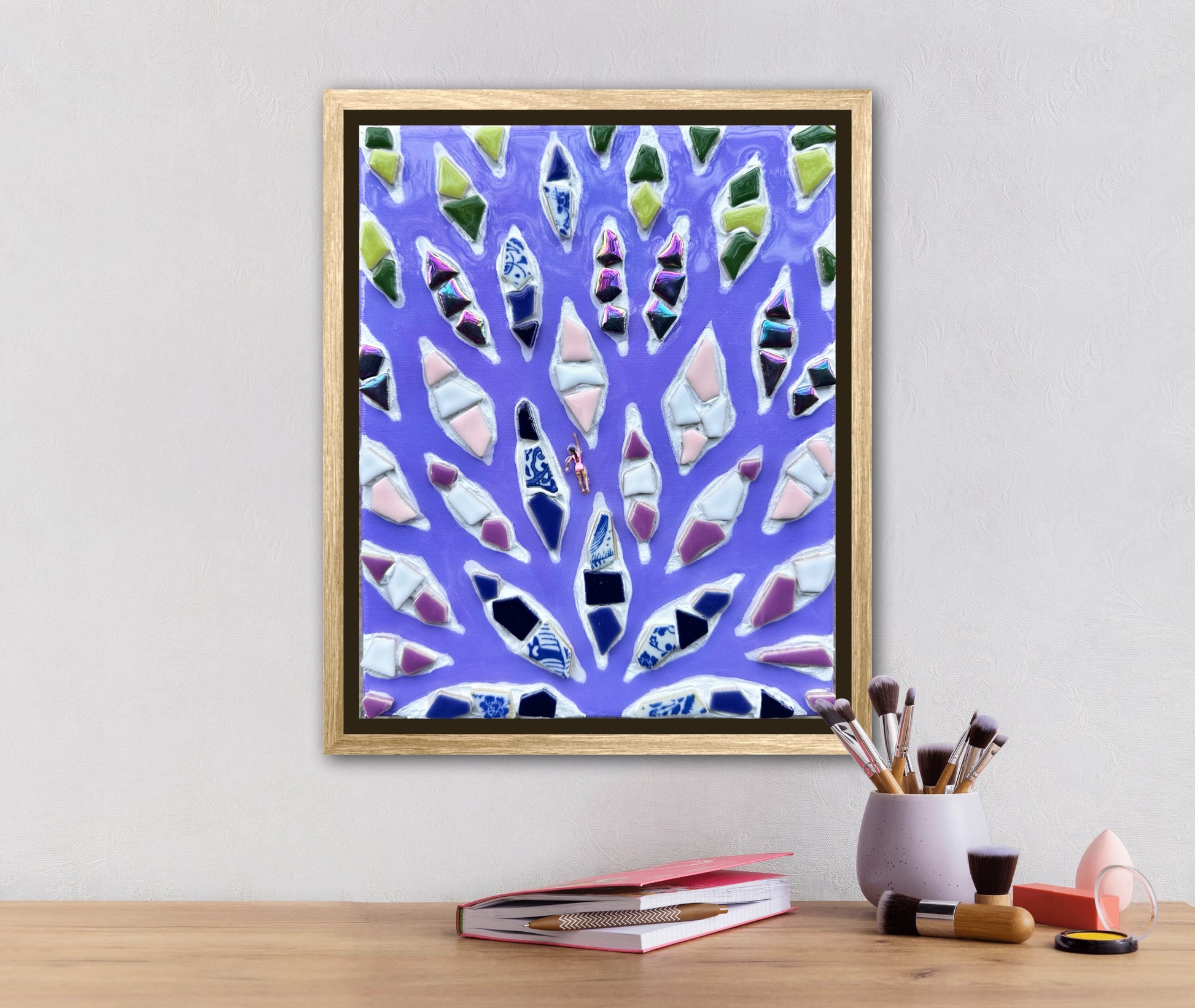 8X10in (9x11in framed) Mixed Media: sand, vibrant acrylic paint, resin, mosaic tiles, and a miniature swimmer figurine on 1.5in thick professional grade stretched canvas in a solid natural wood float frame.