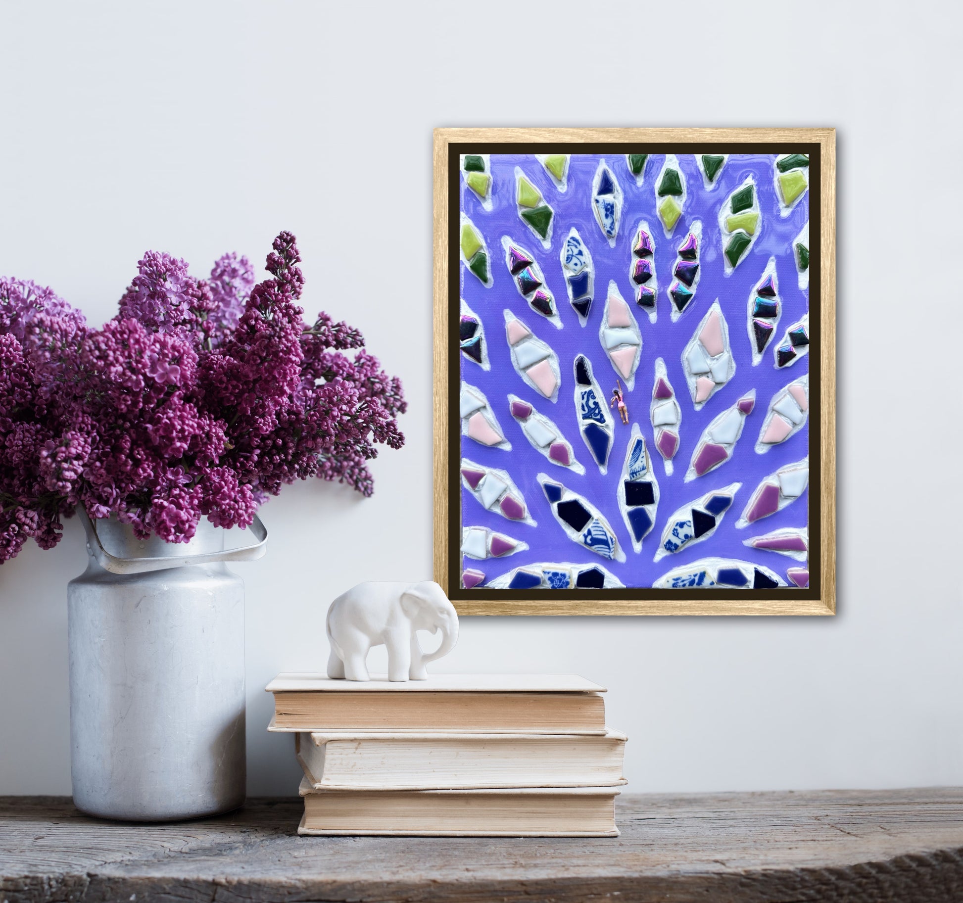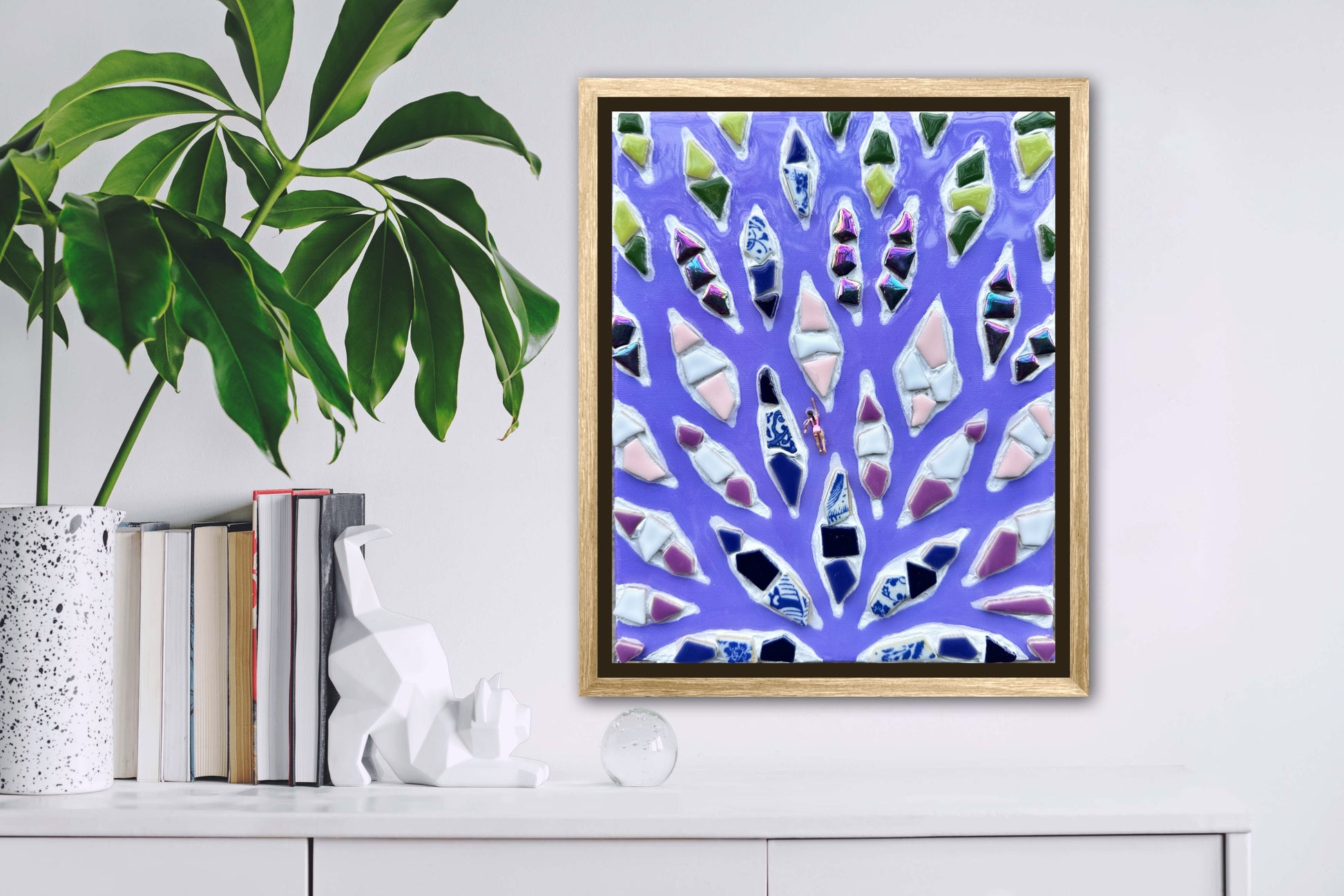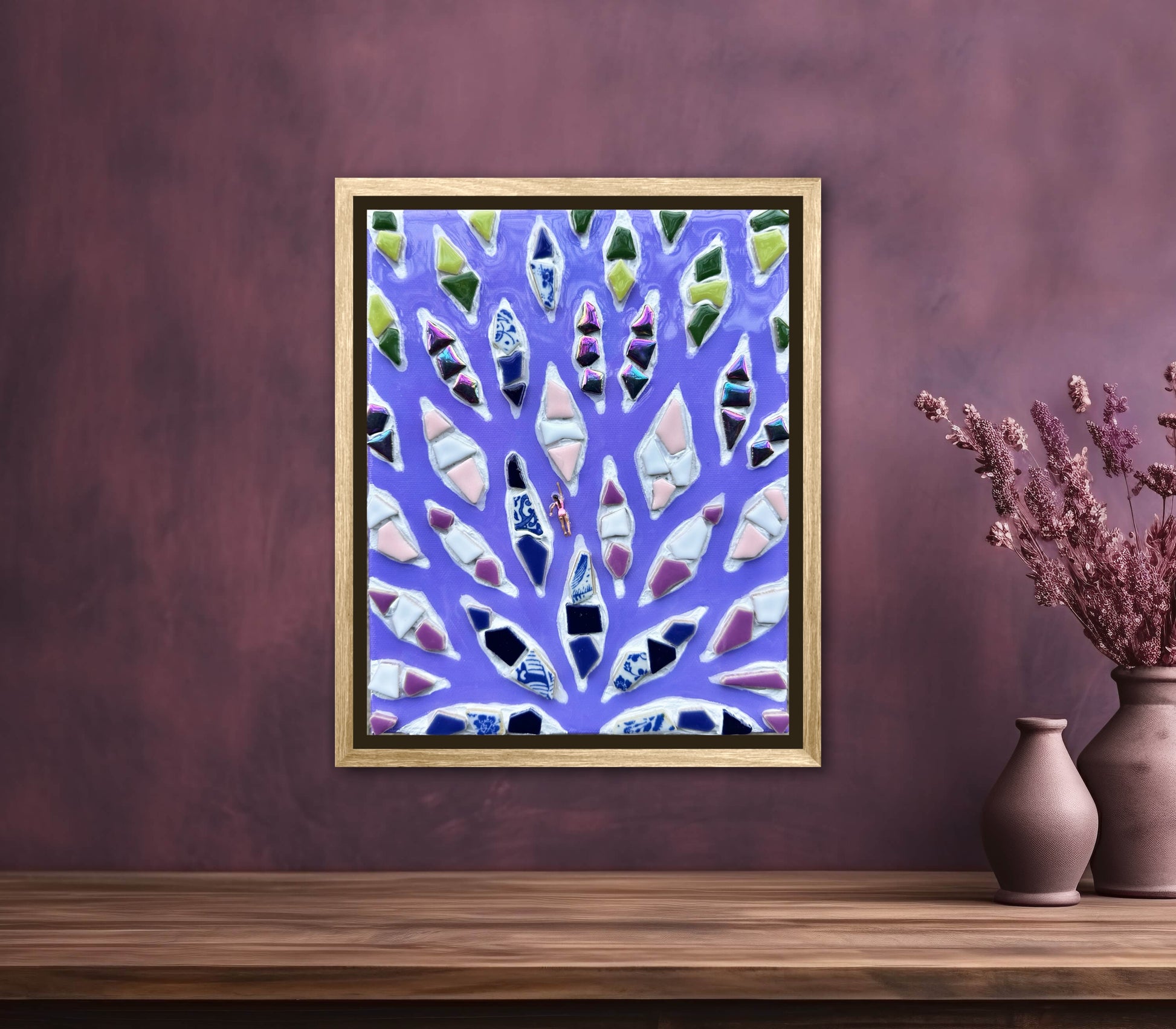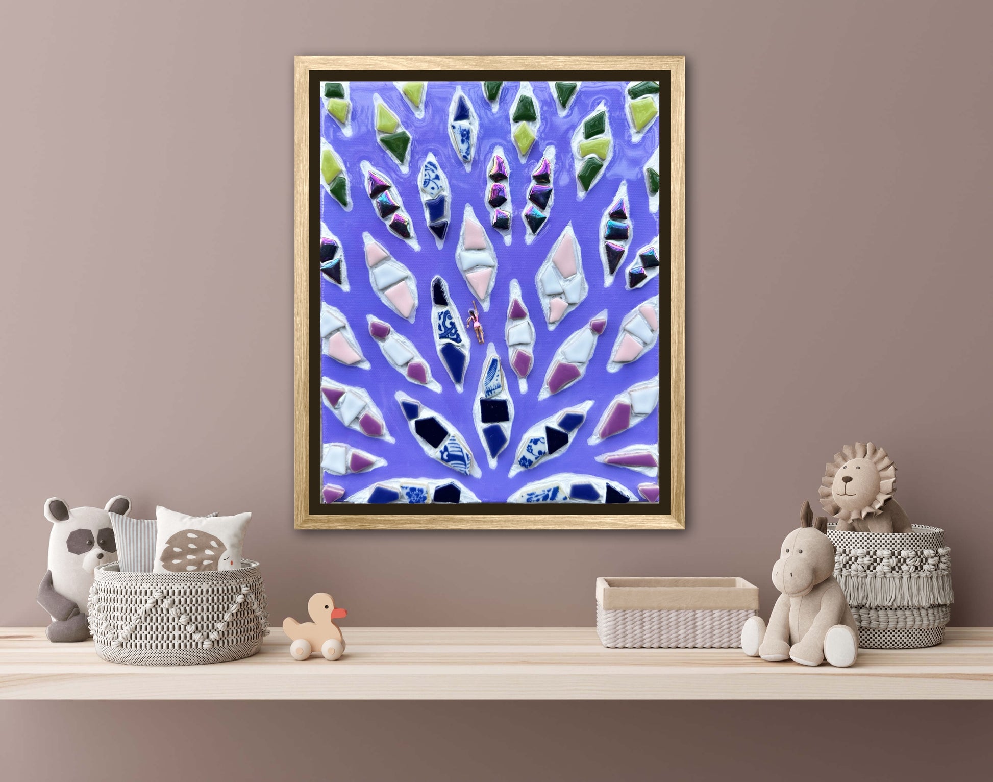 8X10in (9x11in framed) Mixed Media: sand, vibrant acrylic paint, resin, mosaic tiles, and a miniature swimmer figurine on 1.5in thick professional grade stretched canvas in a solid natural wood float frame.