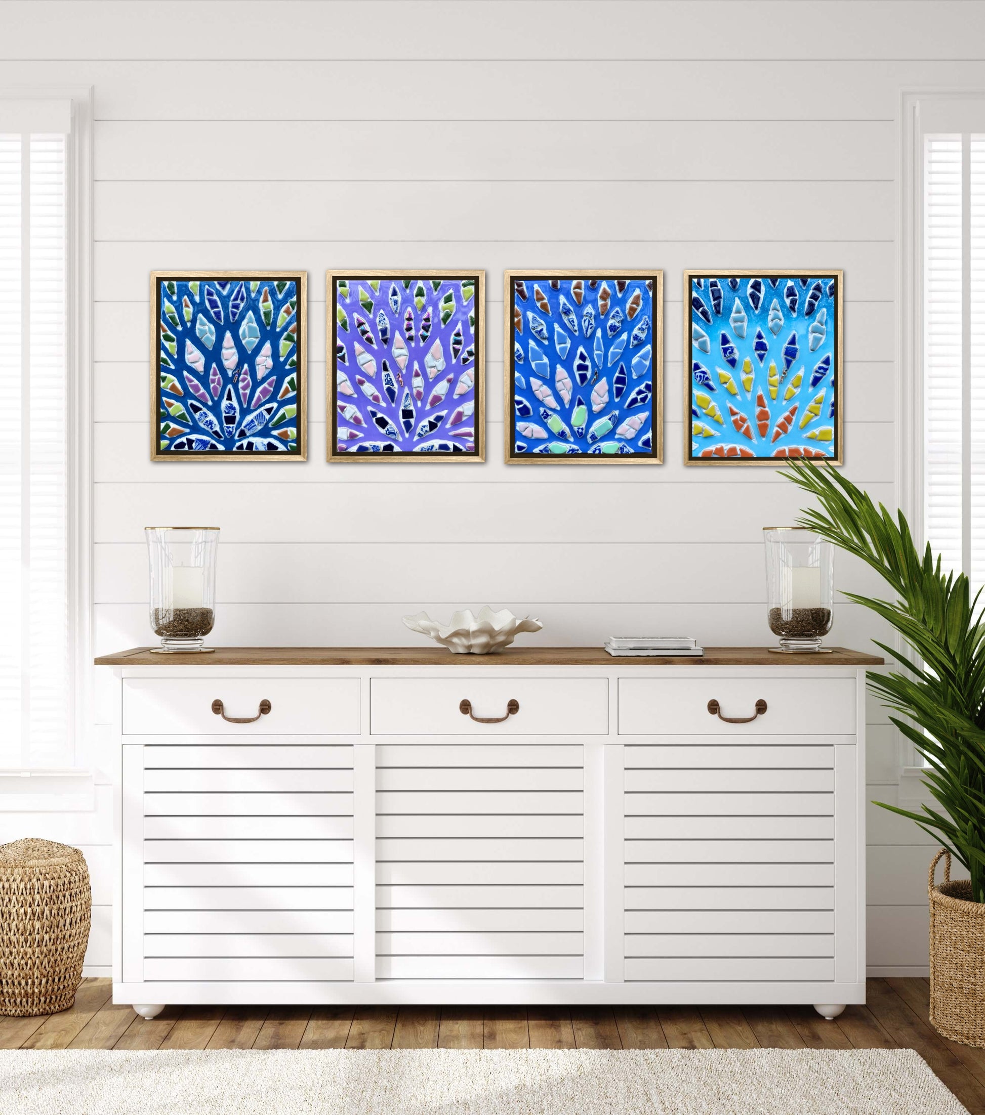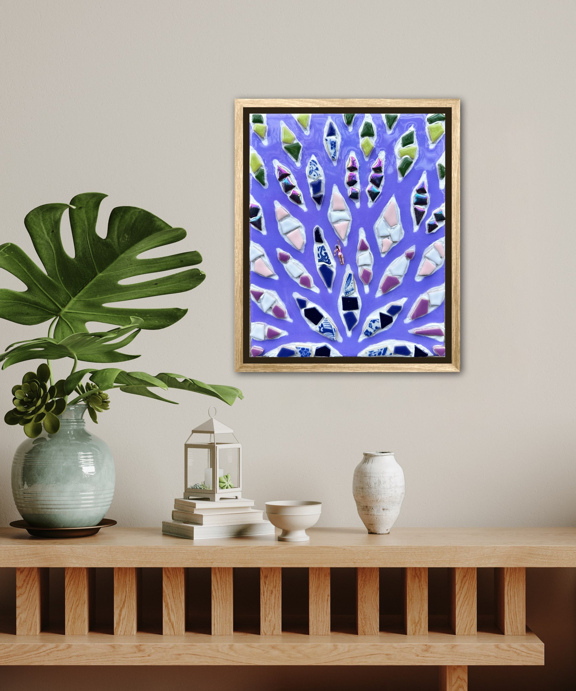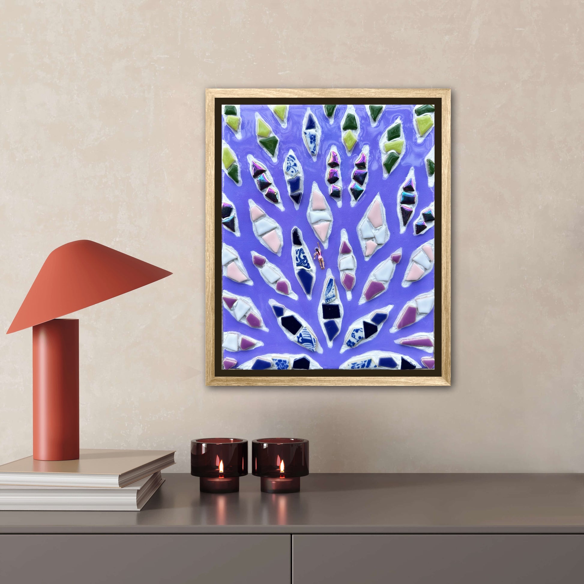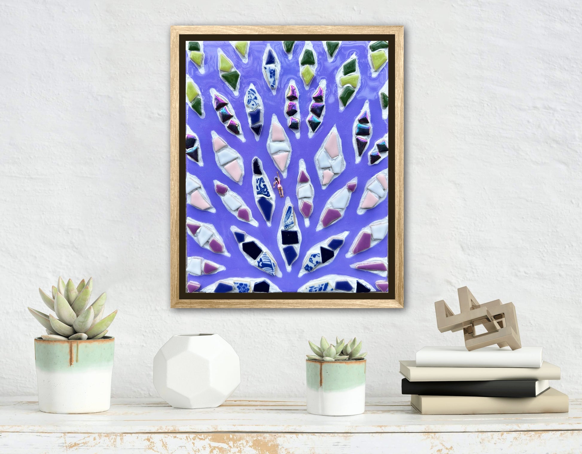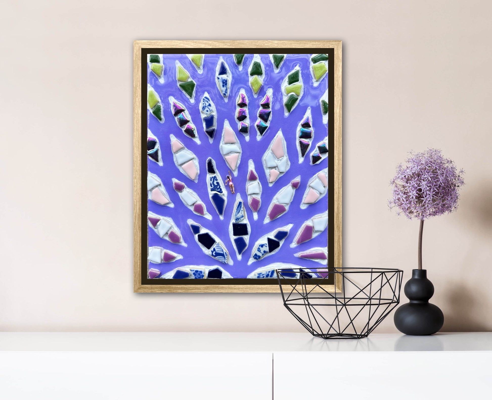 8X10in (9x11in framed) Mixed Media: sand, vibrant acrylic paint, resin, mosaic tiles, and a miniature swimmer figurine on 1.5in thick professional grade stretched canvas in a solid natural wood float frame.