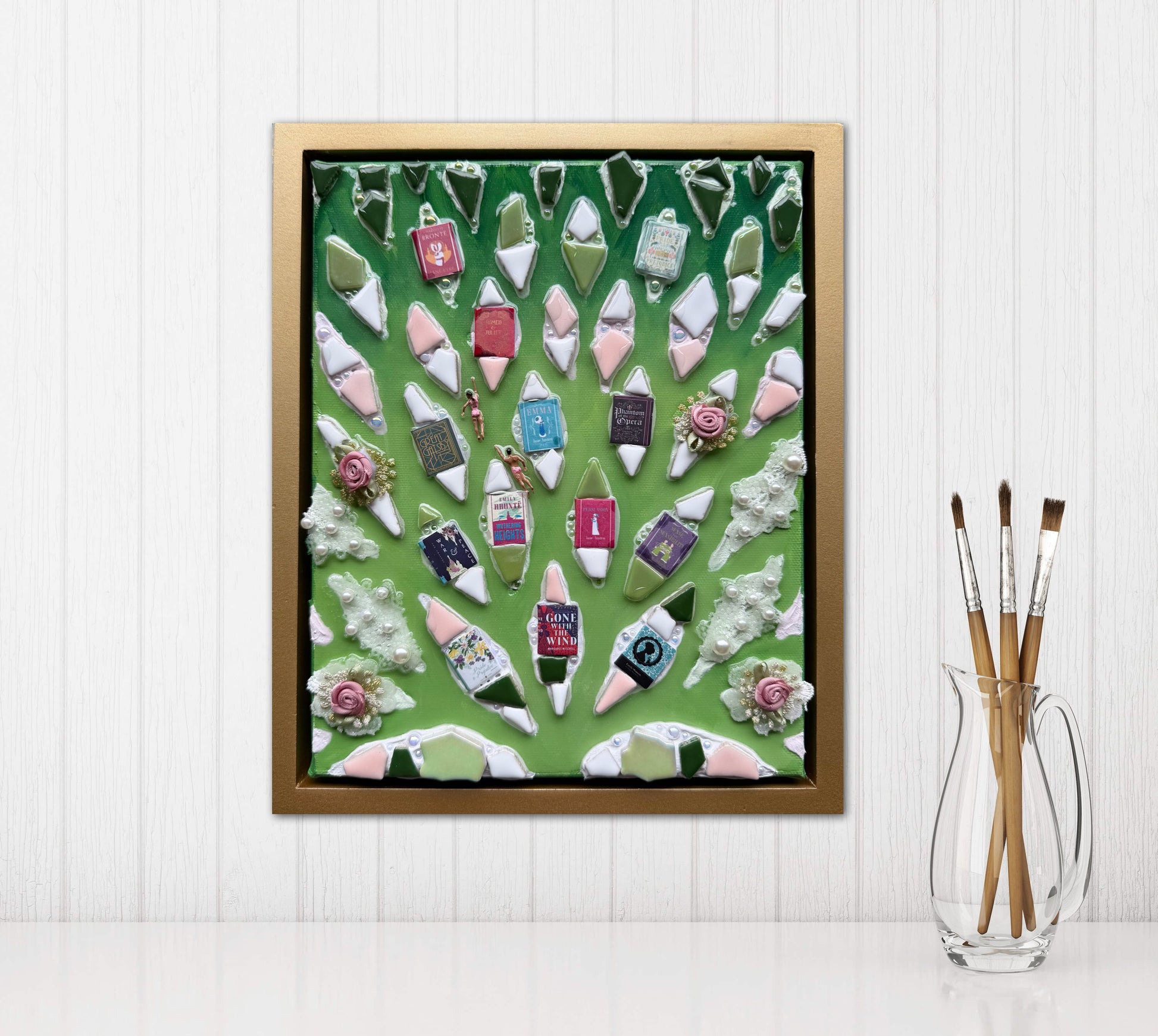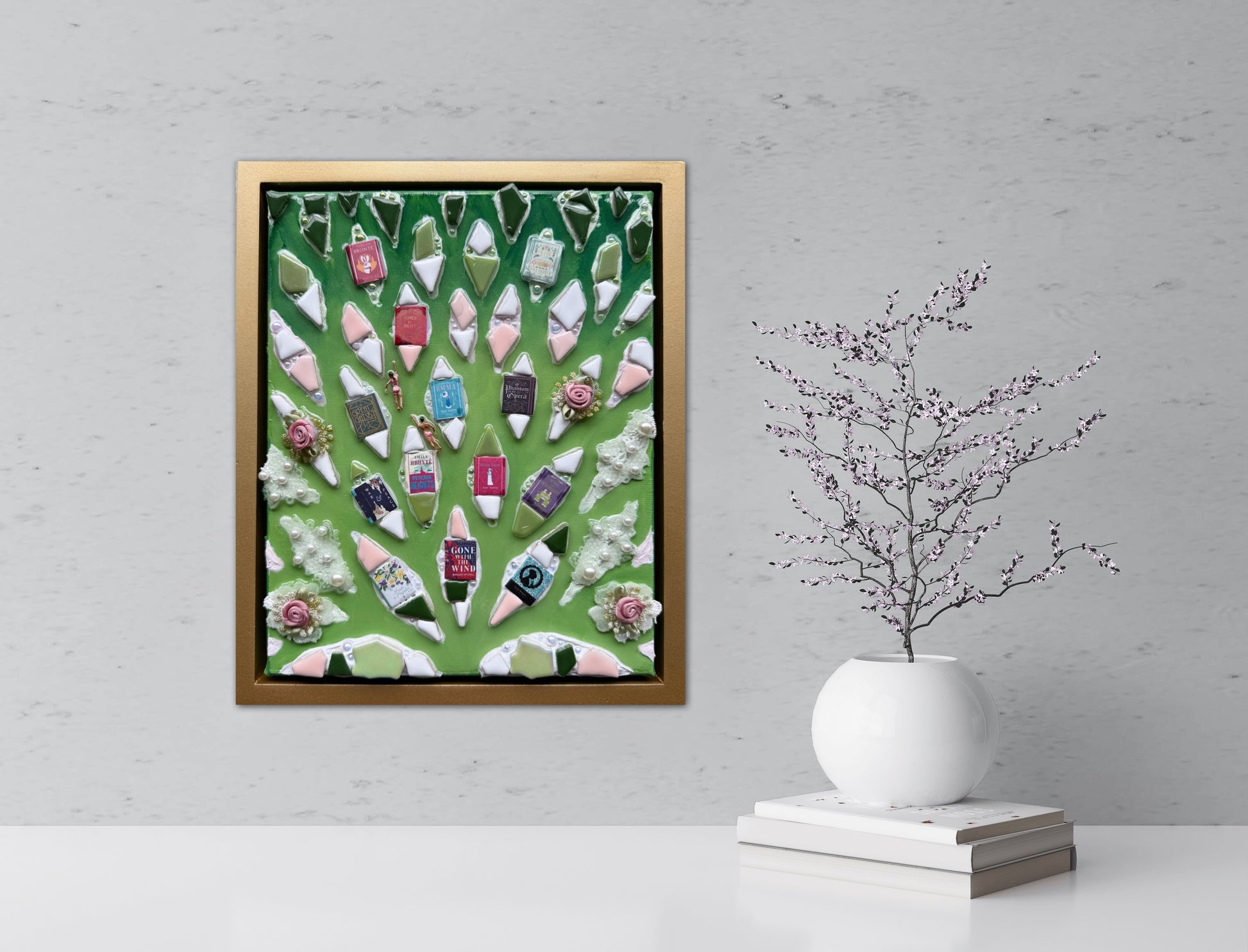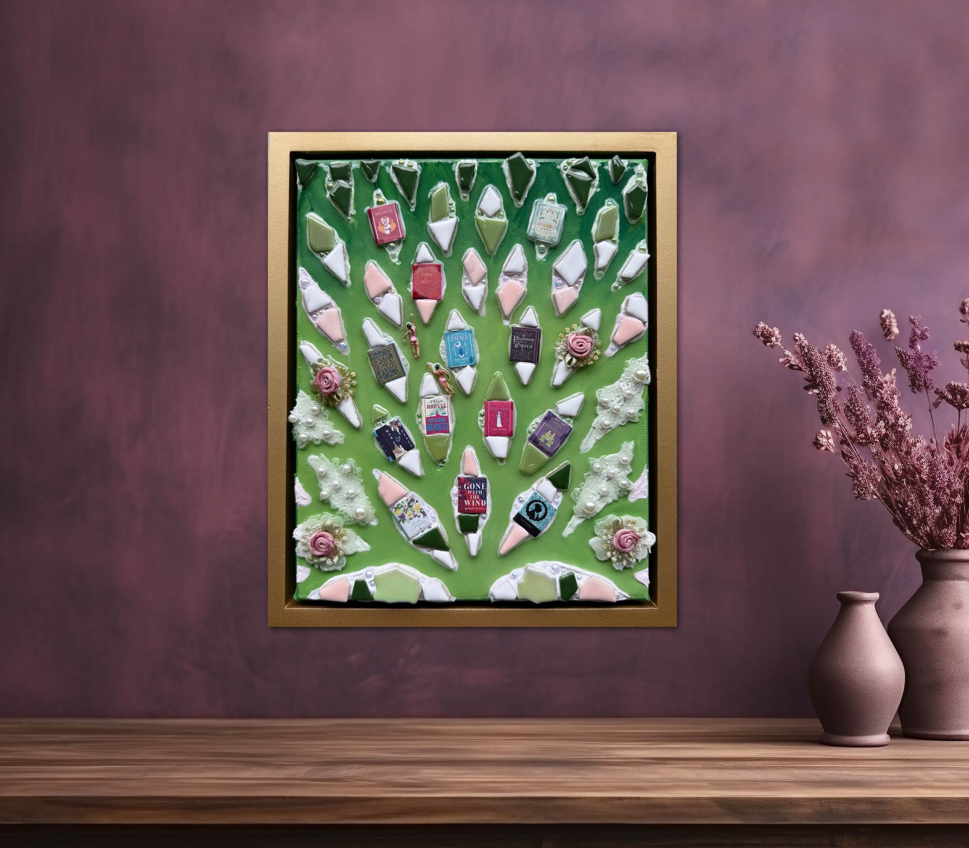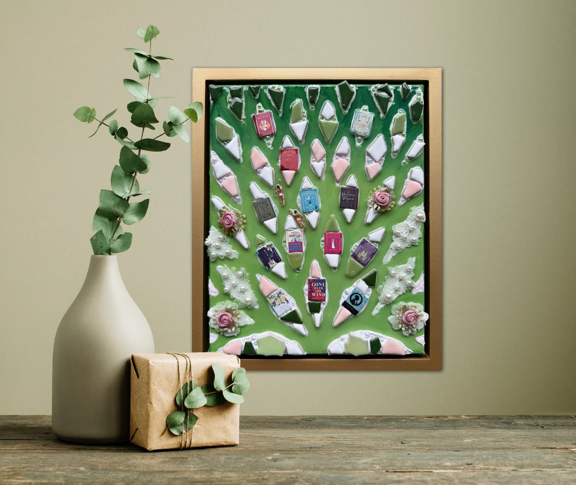“The Path to Romance’ 8x10in (9x11in framed) Mixed Media: sand, vibrant acrylic paint, resin, mosaic tiles, and a miniature swimmer figurine on 1.5in thick professional grade stretched canvas in a solid natural wood float frame.