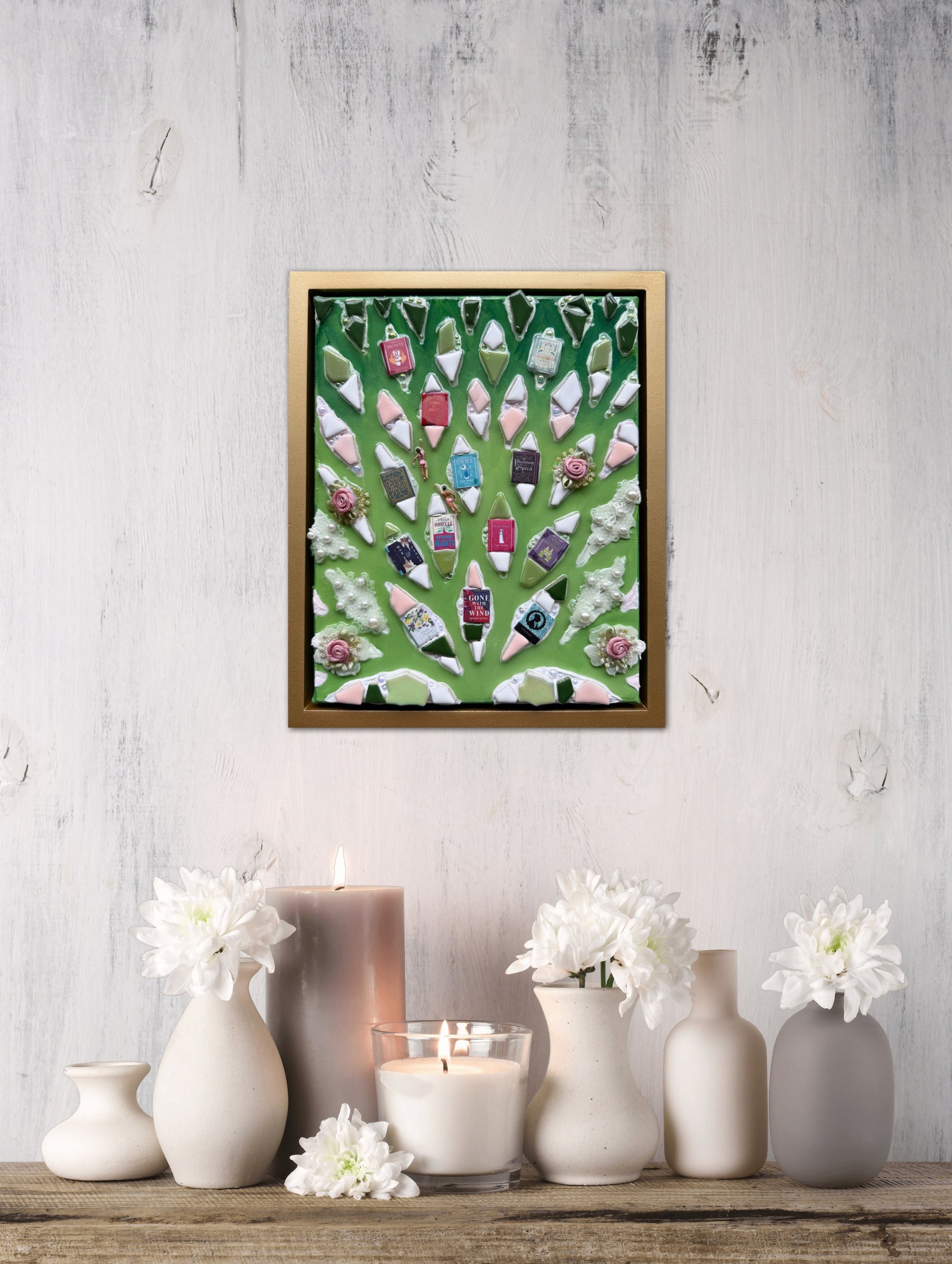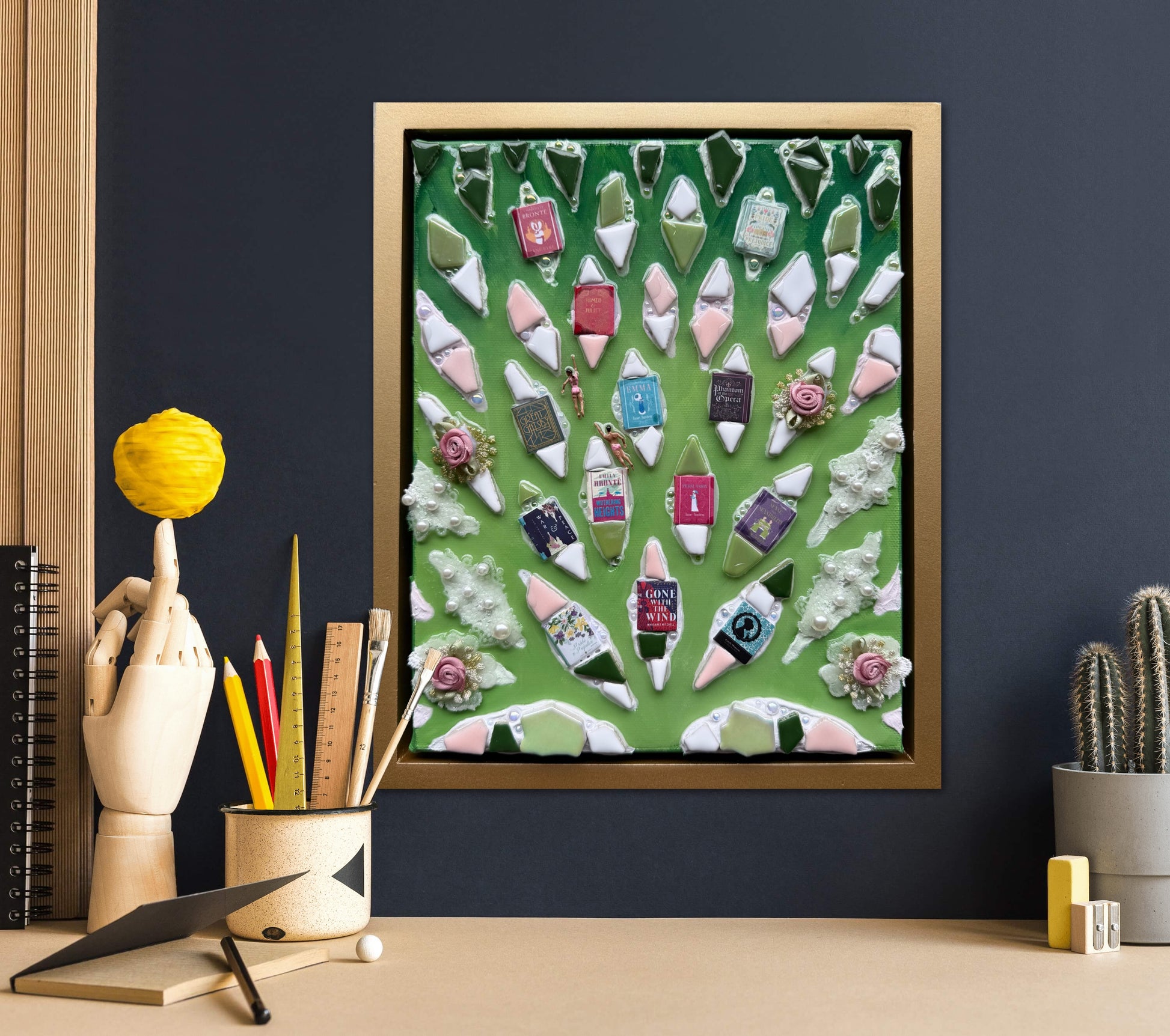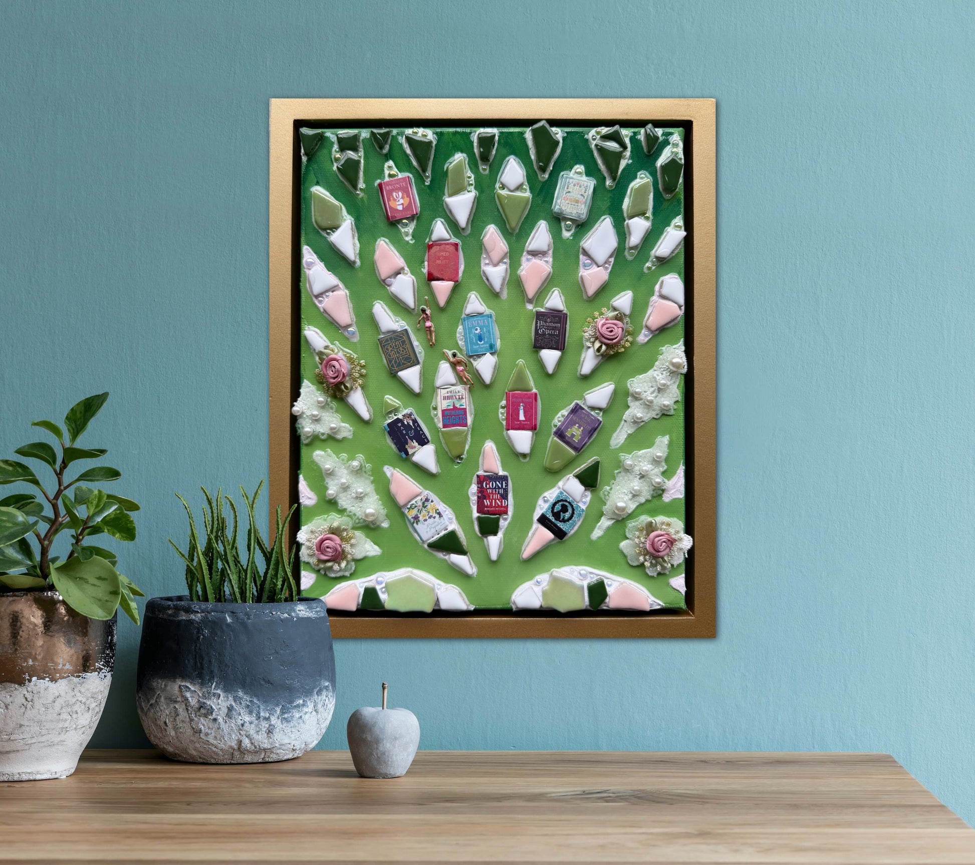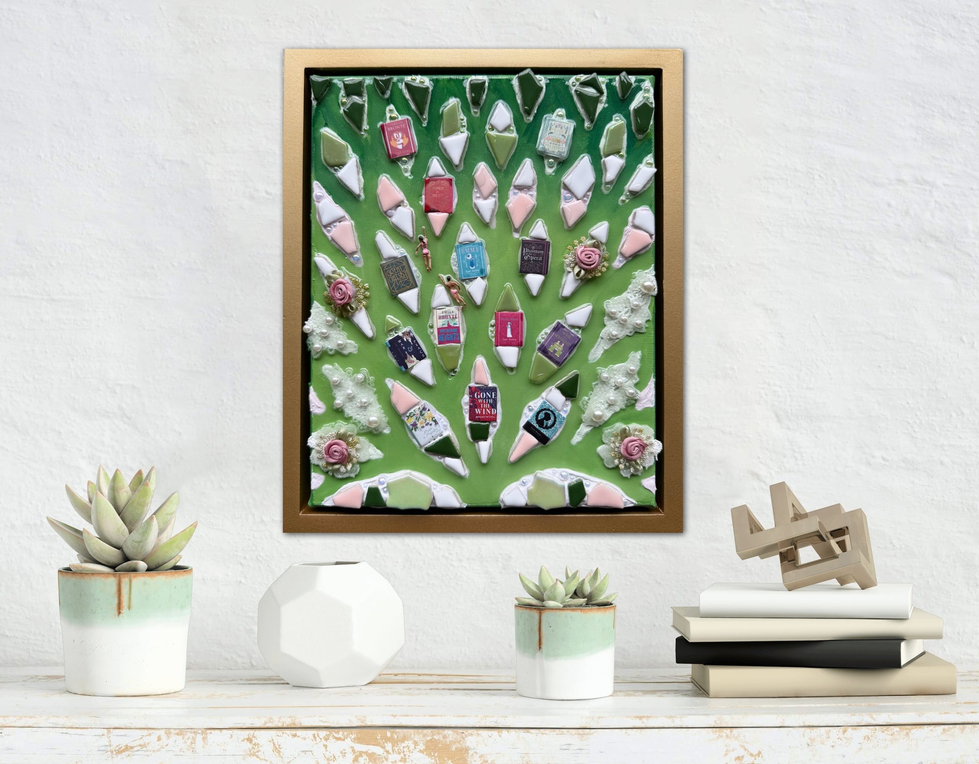 “The Path to Romance’ 8x10in (9x11in framed) Mixed Media: sand, vibrant acrylic paint, resin, mosaic tiles, and a miniature swimmer figurine on 1.5in thick professional grade stretched canvas in a solid natural wood float frame.