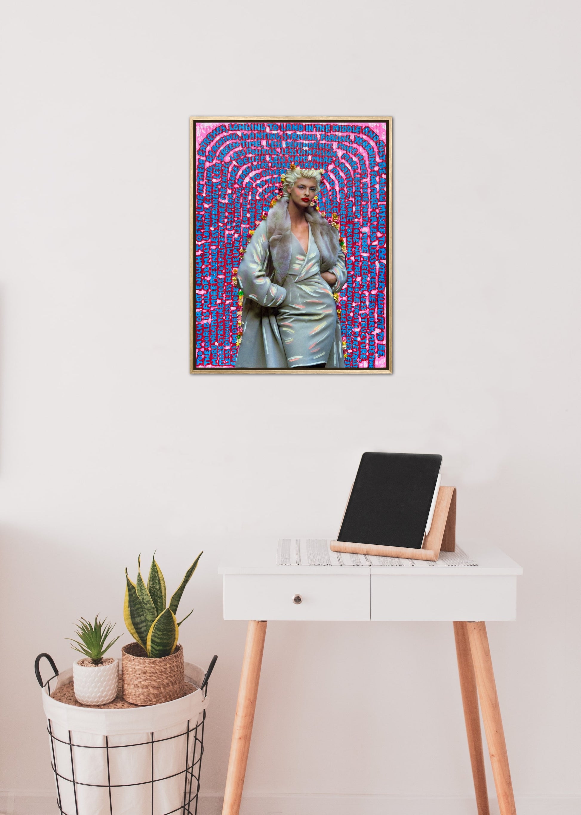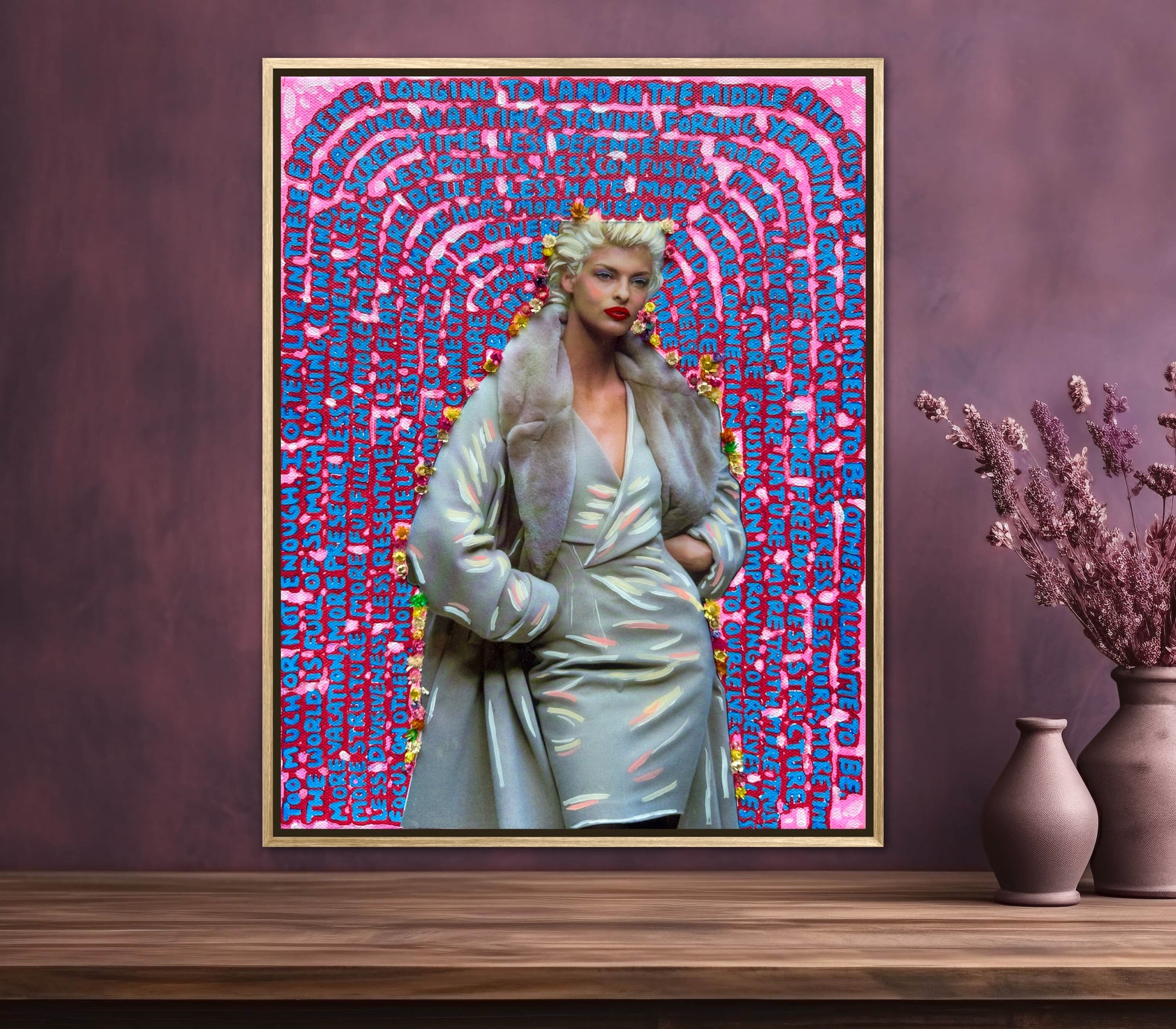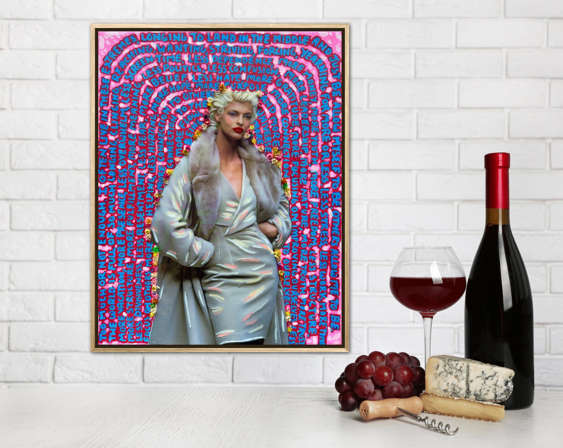 “Just Be” is a 11x14in original Mixed Media painting made with a vintage fashion magazine featuring Linda Evangelista in 90s fashion reimagined into art with acrylic paint, oil based paint pens, words of wisdom, and resin on canvas framed in a solid wood float frame.